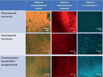 Рис. 6. Визуализация влияния МВ на 3D-модели ОА. Окрашивание показывает: альциановым синим – выработку гликозоаминогликанов, гематоксилином и эозином – клеточность напечатанных образцов, на наличие коллагена II – функциональность хондроцитов.
