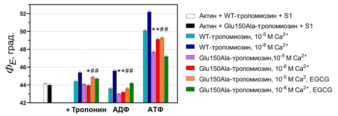 Влияние ингибитора тропонина EGCG на конформационное состояние головок миозина в мышечном волокне в присутствии мутантного тропомиозина. Наши ранее полученные данные (Borovikov et al., 2018) и настоящая работа дают представление о потенциальных мишенях, на которые можно воздействовать для восстановления сократительной функции в присутствии мутации Glu150Ala в Tpm3.12. Такими мишенями может служить ингибирование сильных форм связывания миозина с актином и снижение Са2+-чувствительности тропонин-тропомиозиновой регуляции.