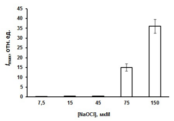 Чтобы исключить вклад в ХЛ нейтрофилов свободнорадикальных продуктов, образуемых при взаимодействии люминола с NaOCl, нами изучена зависимость максимальной интенсивности ХЛ, возникающей в реакции окисления люминола NaOCl в исследуемом диапазоне концентраций. Как показано на рис. 3, свечение практически не регистрируется при концентрации гипохлорита натрия от 1.5 до 45 мкМ.