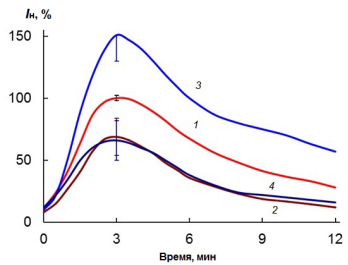Рис. 7. Действие восстановленного глутатиона (GSH) на усиленную гипохлоритом хемилюминесценцию люминола в суспензии нейтрофилов крови кролика. Кривая 1 – контроль (к нейтрофилам добавлен люминол и ФМА); 2 – GSH (0.2 мМ) введен в суспензию нейтрофилов до ФМА; 3 – NaOCl (5 мкМ) введен в суспензию нейтрофилов за 3 мин до ФМА; 4 – NaOCl (5 мкМ) введен в суспензию нейтрофилов за 3 мин до GSH (0.2 мМ) и ФМА. Iн, – нормированная к контролю (100% в максимуме) интенсивность ХЛ. Представлены усредненные зависимости интенсивности ХЛ по данным пяти независимых опытов; разброс данных представлен среднеквадратичной ошибкой средней величины.