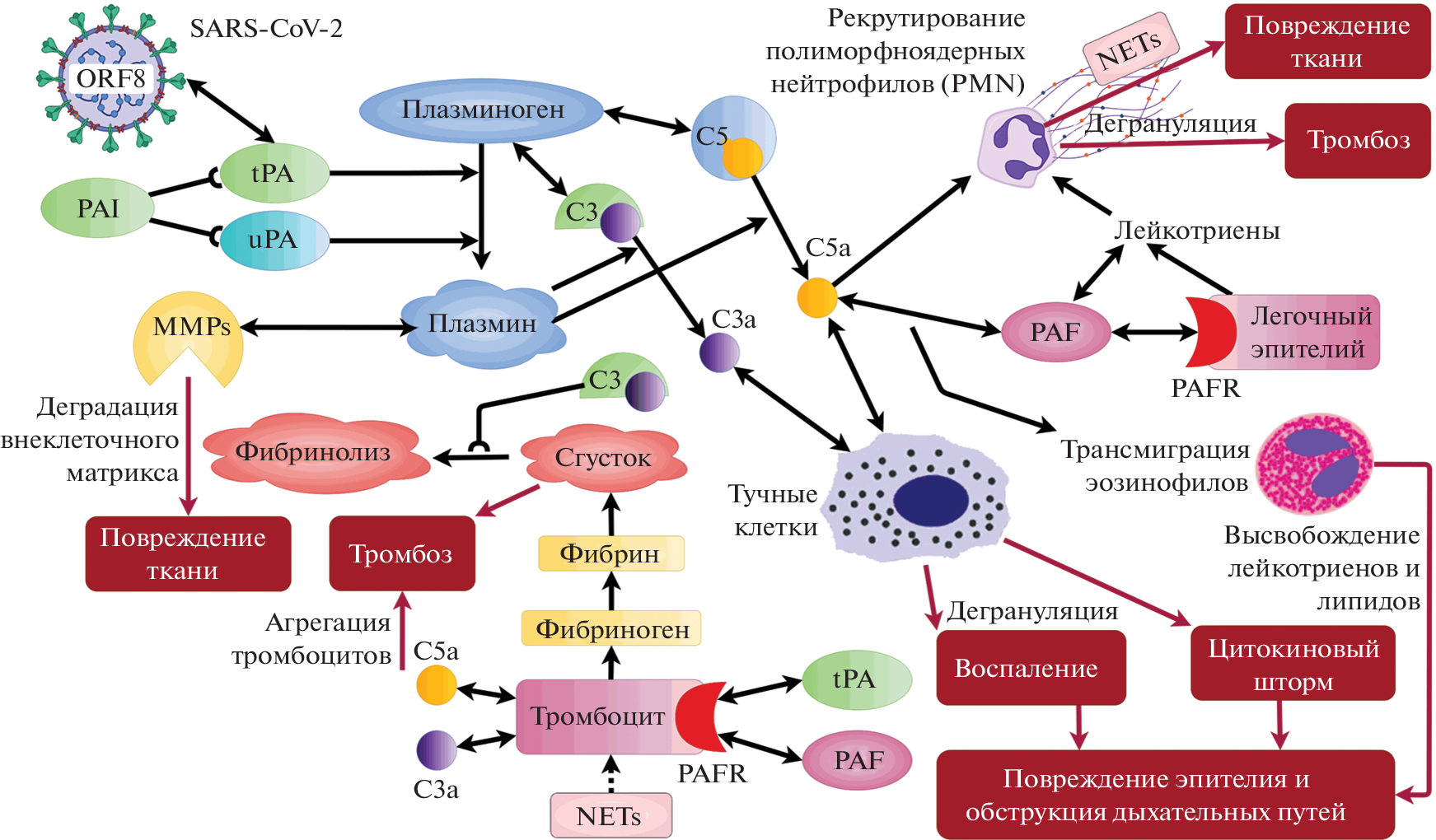 - Mukund K., Mathee K., Subramaniam S. Plasmin cascade mediates thrombotic events in SARS-CoV-2 infection via complement and platelet-activating systems // IEEE Open J. Eng. Med. Biol. 2020. V. 1. P. 220–227. https://doi.org/10.1109/OJEMB.2020.3014798