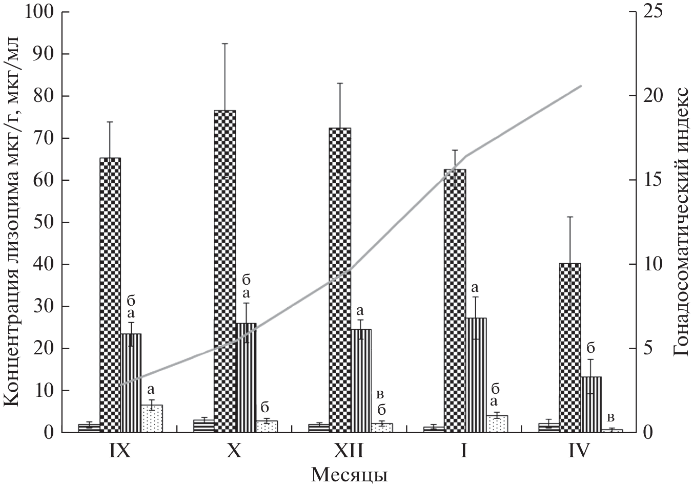 The effect of the gonad development in the pike Esox lucius females on the quantitative parameters of the lysozyme, a component of nonspecific resistance, and the size of some the immune system organs was studied from September to April. The variability of the lysozyme concentration as an indicator of the amount of enzyme in a fixed dimension, as well as the total amount of lysozyme in the whole organ was evaluated. It is established that during the period of female maturation and gonad development the concentration of lysozyme in the serum and spleen significantly decreases. At this time, the size of the liver increases, and the spleen decreases, the kidney index remains unchanged. The concentration of lysozyme in the liver and serum is inversely correlated with the increase of the gonads, but the dependence on the gonads size is weak. The growth of the gonads and a significant increase in the size of the liver do not affect the lysozyme index of the liver, which reflects the total amount of the enzyme in this organ. It was found that the decrease in the enzyme concentration in the liver is proportional to the increase in the size of the organ. A direct relationship was found between the quantitative parameters of the lysozyme in the kidney and the total amount of the enzyme and the size of the spleen, therefore, a decrease in the concentration and total amount of lysozyme in the kidney may be a manifestation of the indirect effect of gonad maturation. The concentration of lysozyme in the serum showed a direct relationship with the water temperature of the water body, but such a relationship was not manifested in the organs. In the studied period, the quantitative parameters of the enzyme in the spleen and the relative size of the organ turned out to be more related to the water temperature than to the gonadosomatic index. The maturation of the gonads in females, combined with the external influence of temperature, has both a direct and indirect effect on the concentration of lysozyme in tissues. The concentration of tissue lysozyme as an indicator with a fixed dimension can be determined not only by the state of immunity, but also by changes in the size of organs. Determination of the total amount of lysozyme in the immune system organs increases the objectivity of assessing the influence of the physiological state of the organism on the nonspecific immunity of fish.