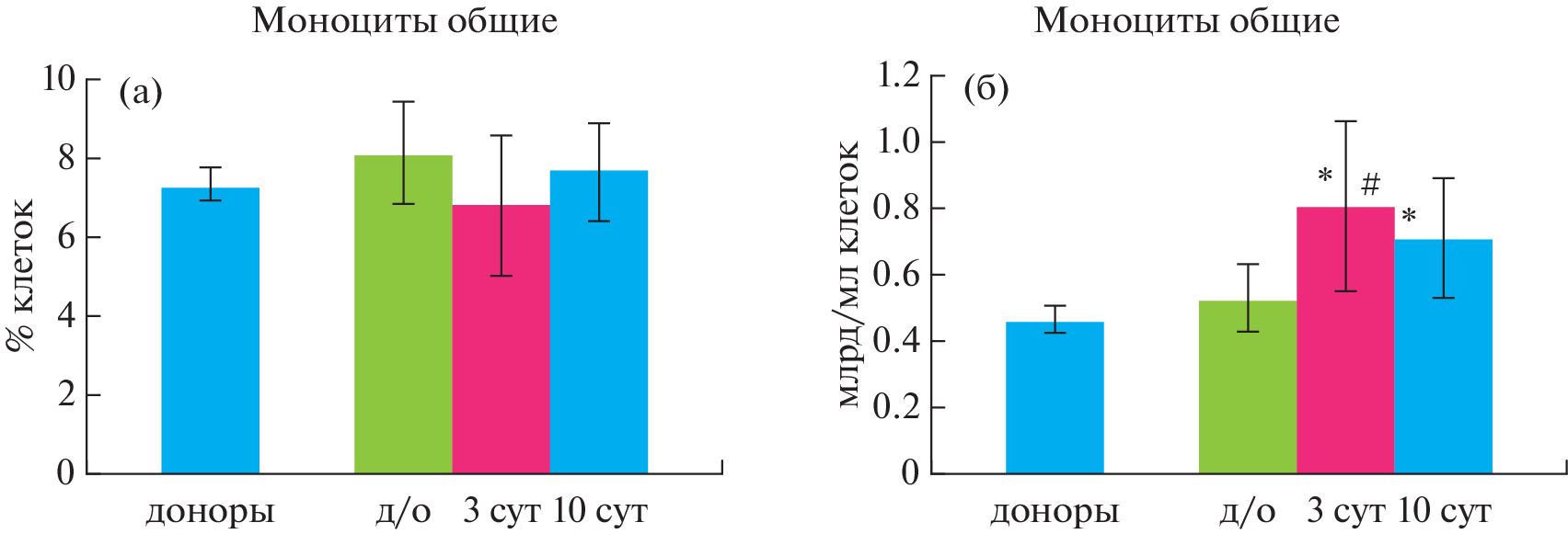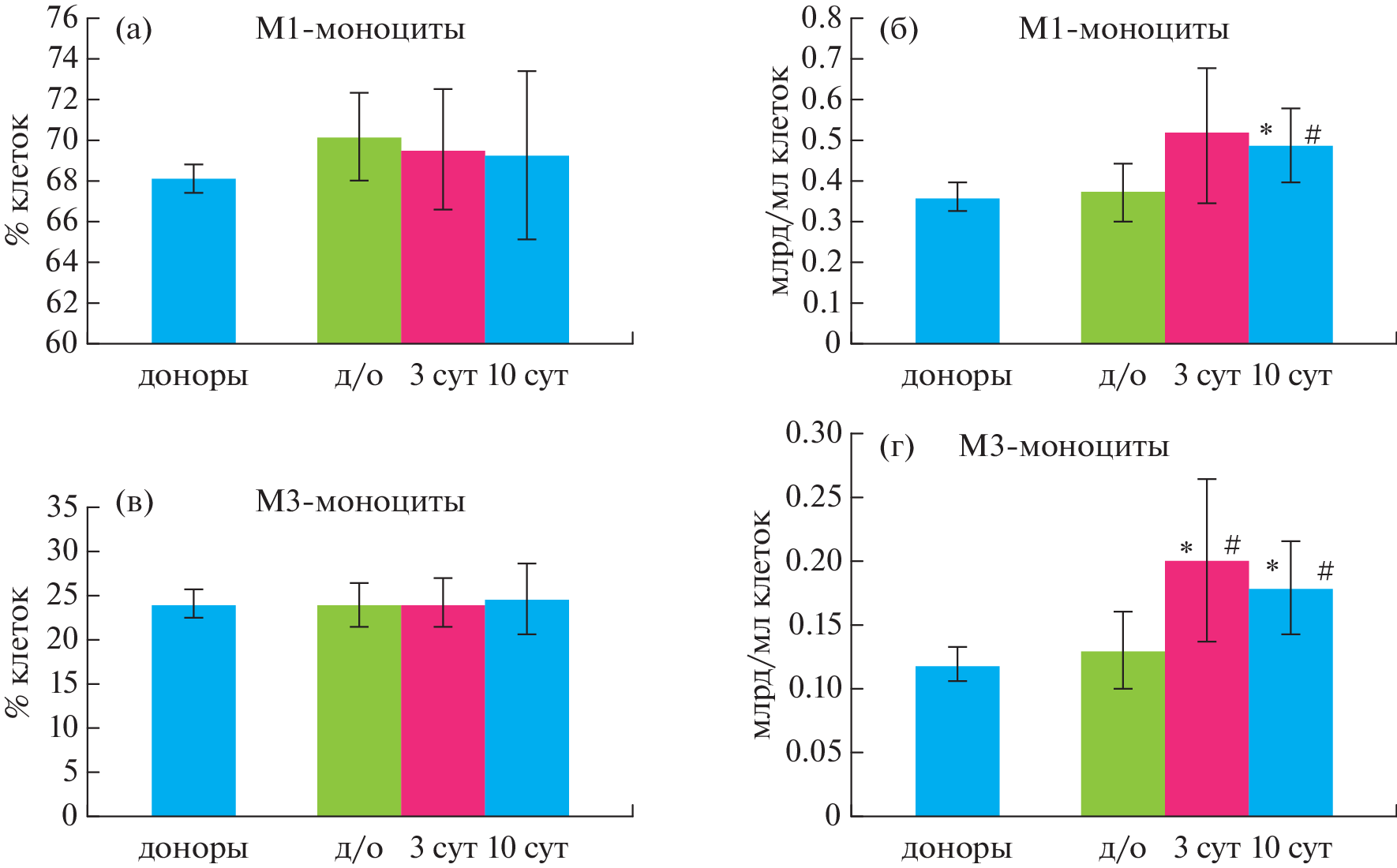 In patients undergoing cardiosurgical operations under conditions of extracorporeal circulation, continued high-volume controlled hemodiafiltration was used, the content of subpopulations of monocytes M1, M2, M3, CD4+ monocytes and total monocytes was studied in the circulation before surgery and on days 3 and 10 after it. Previously unknown data have been discovered that can be used in the diagnosis and prognosis of cardiac surgery.