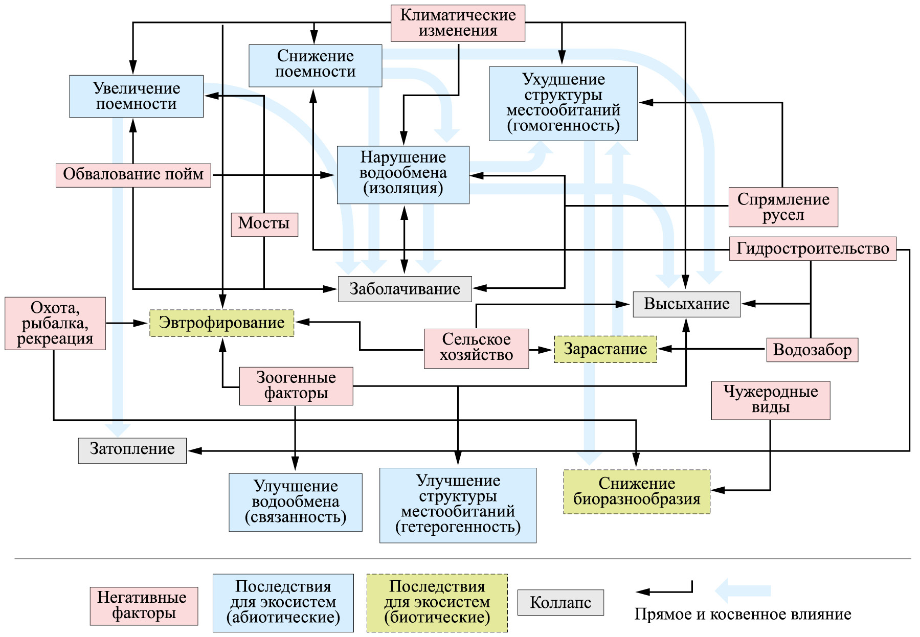 Если подытожить все описанные угрозы и их воздействие на экосистемы, то можно предложить такую схему современных процессов в экосистемах пойменных водоемов (рис. 1).