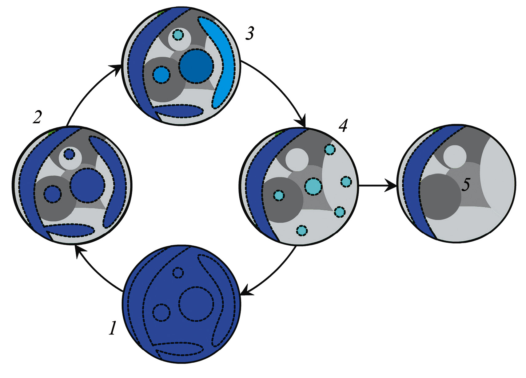 Рис. 2. Схема динамики системы пойменных водоемов. Оттенками синего цвета и прерывистой границей показаны пойменные водоемы, серые участки — наземные экосистемы. Условные стадии изменений системы водоемов (аналогия годового цикла с межгодовой динамикой): 1 — высокое половодье; 2 — гомогенизация пойменных водоемов после схода паводковых вод (“весна” — годы вслед за максимальным половодьем); 3 — наибольшее разнообразие водоемов (“лето” — годы без высоких паводков); 4 — высыхание и гомогенизация водоемов (“осень” — многолетнее маловодье); 5 — коллапс системы пойменных водоемов.