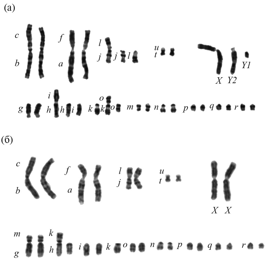 Рис. 2. G-окрашенные кариотипы обыкновенной бурозубки из полиморфных популяций в бас. р. Днепр, Беларусь. (а) – кариотип с двумя диагностическими метацентриками hi, ko расы Киев, (б) – кариотип с двумя диагностическими метацентриками gm, hk расы Западная Двина.