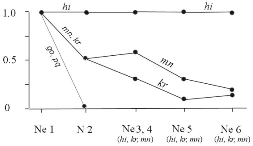 Начиная с левобережья р. Сож (рис. 1, Ne 3), в популяциях не обнаруживается соединений go и pq расы Нерусса, но метацентрик hi остается фиксированным во всех исследованных полиморфных популяциях. Постепенное снижение частоты и выпадение метацентриков расы Нерусса в популяциях показаны на рис. 3. Частота метацентриков kr и mn уменьшается постепенно до 0.1–0.3 по р. Днепр (рис. 3, Ne 5, Ne 6) по мере удаления от популяций расы Нерусса с фиксированными метацентриками, при этом найденные частоты гомо- и гетерозигот не отличаются значительно от ожидаемых (табл. 1). Акроцентрический кариотип не сохранился в популяциях с метацентриками расы Нерусса из-за фиксированности метацентрика hi.