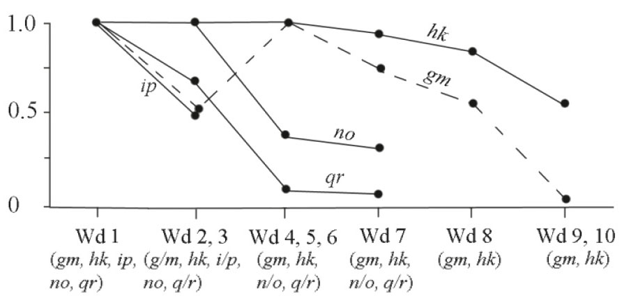 Некоторые метацентрики исчезают из популяций на относительно небольших участках ареала. Так, на небольшом участке ареала обыкновенной бурозубки, около 50 км, между г. Новозыбков и г. Добруш из популяций исчезают метацентрики go и pq расы Нерусса (риc. 1, Ne 2, Ne 3). Метацентрик gm расы Киев исчезает на левобережье сравнительно небольшой в настоящее время р. Припять, которая в позднем плейстоцене представляла существенную водную преграду. Метацентрик gm расы Западная Двина отмечается с частотой, превышающей 0.5, в полиморфных популяциях по левобережью р. Березина (рис. 6, Wd 3–8) и исчезает на правобережье (рис. 6, Wd 9–10).