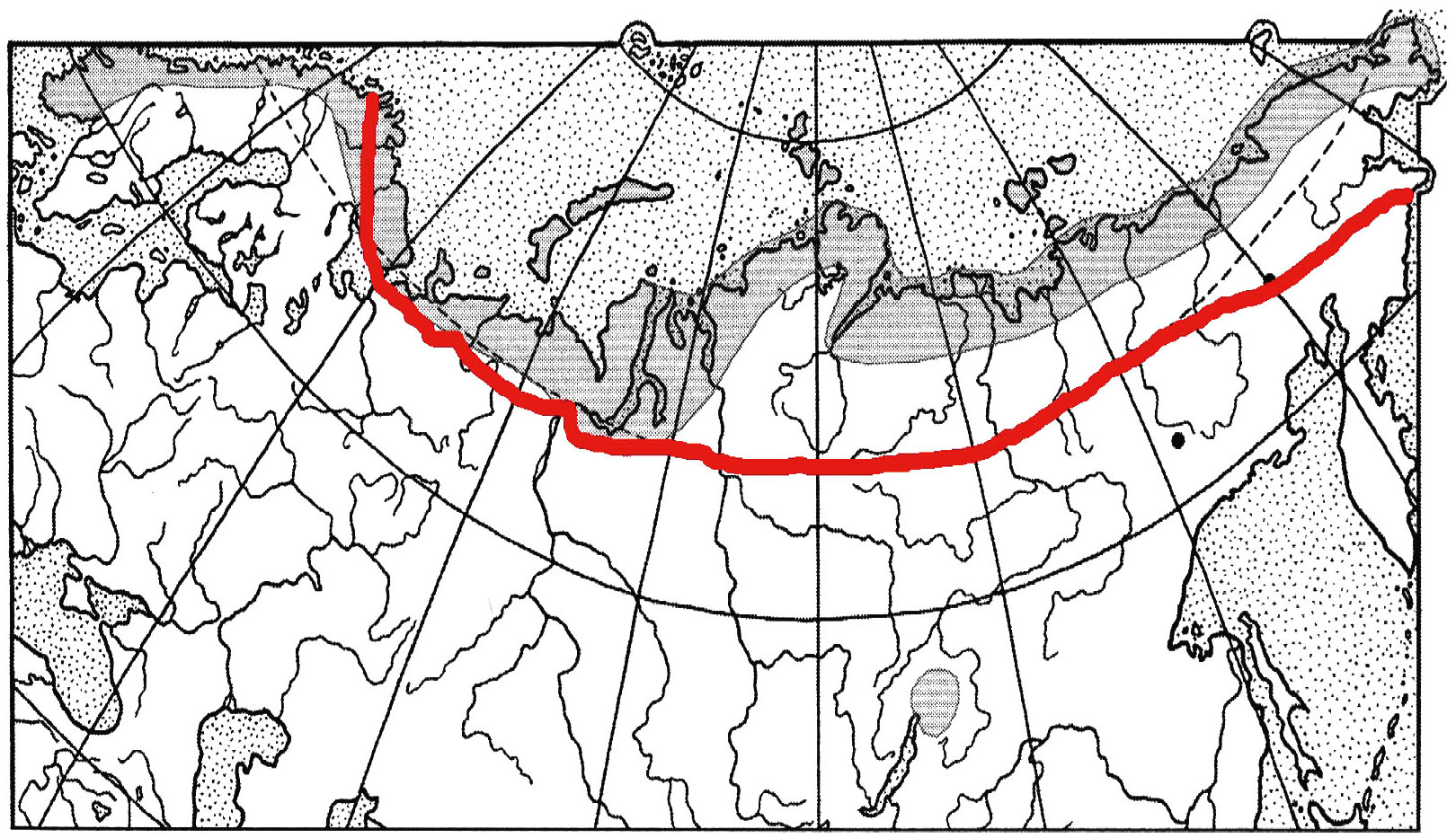 Рис. 1. Пример распространения (окрашено серым) арктического гольца в водоемах Евразии. Толстой красной линией показана южная граница Арктики.