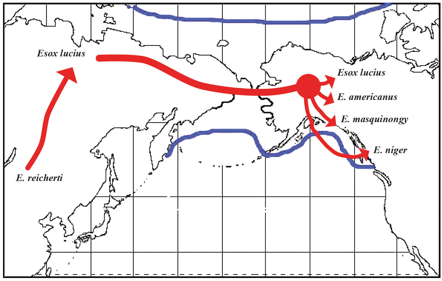 Рис. 2. Проникновение щуки в водоемы Северной Америки во времена Берингии (толстой синей линией показаны границы суши) с образованием там букета новых видов.