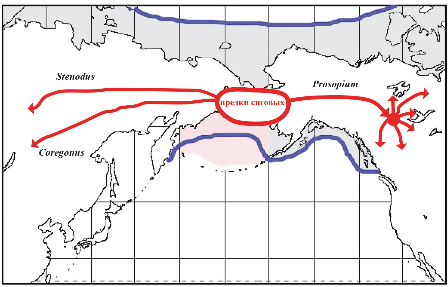 Рис. 3. Пути расселения предков сиговых рыб в Берингии с образованием букета видов вальков в Северной Америке. Толстая синяя линия – граница суши.