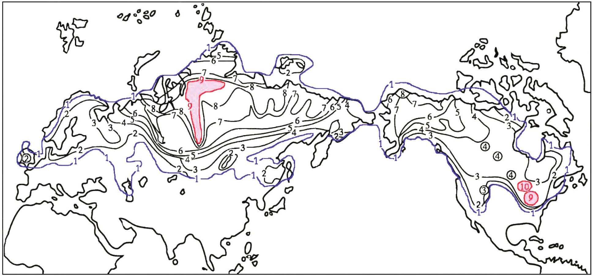 На рис. 4 показано современное распространение сиговых рыб в водоемах Голарктики с учетом плотности видов. Больше всего видов сиговых рыб сегодня имеется в бас. р. Обь – 9 видов (помечено розовым) и в двух из Великих озер Северной Америки – 9 и 10 видов (помечено розовым). Причем в Америке эти центры находятся далеко от Арктики. Таким образом, по современному распространению рыб невозможно судить о центрах возникновения группы сиговых рыб в целом. Современные ареалы и наибольшая плотность видов в бас. р. Енисей и в Великих озерах во многом определяются историей четвертичного периода и не характеризуют собой места возникновения отдельных родов. Места наибольшего современного скопления видов мы называем местами экологического оптимума. Обилие видов указывает не на центр происхождения группы, а на обилие свободных экологических ниш в недалеком прошлом. В одном случае эволюция пошла по пути формообразования, в другом – видообразования. Поэтому концепция, согласно которой центры происхождения находятся там, где больше всего современных видов, к сиговым рыбам не применима.