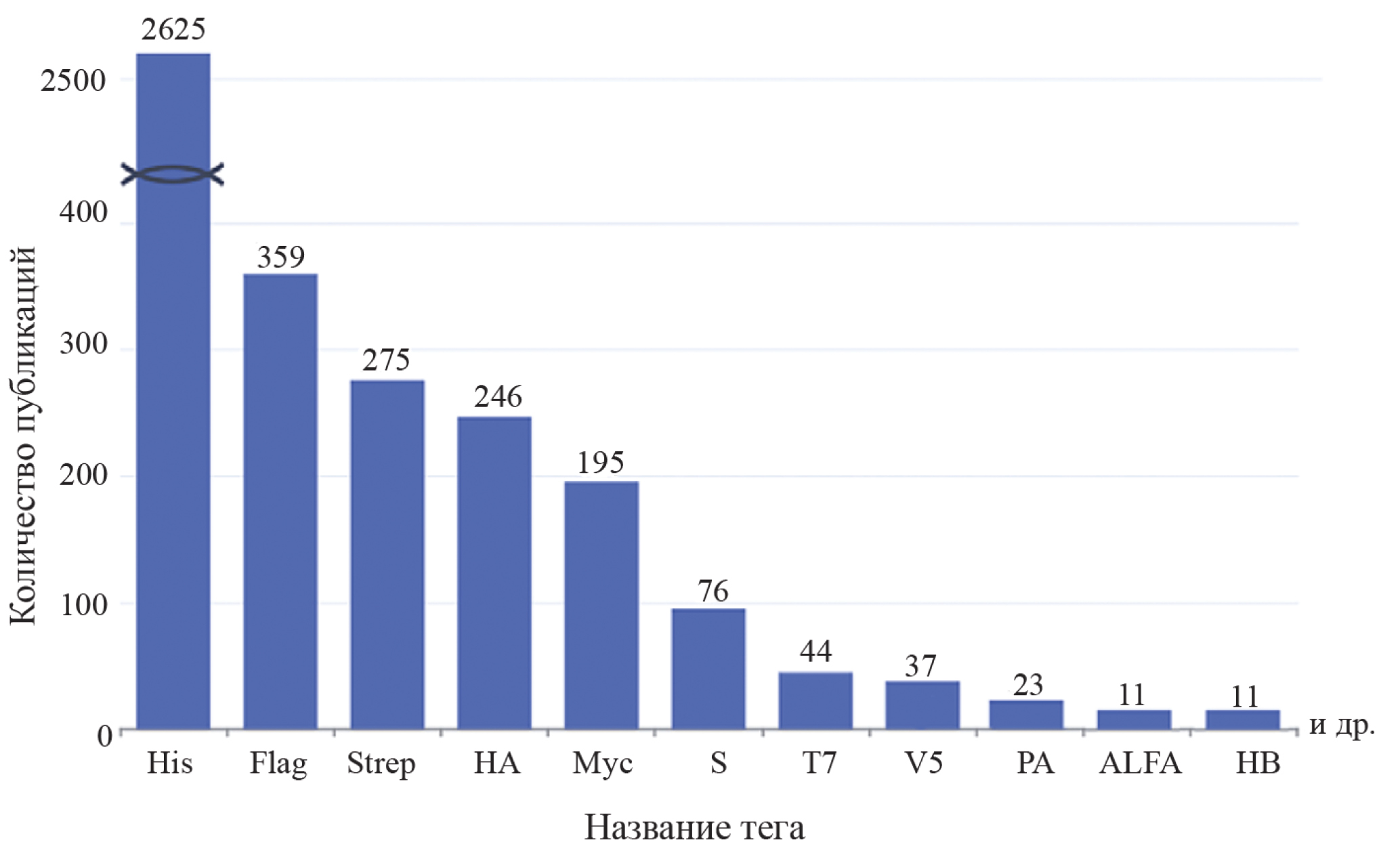 Мы сопоставили описанные в литературе теги-эпитопы по востребованности (Kimple et al., 2013) и построили гистограмму, отображающую количество публикаций по данным PubMed, для часто упоминаемых меток (рис. 1). Хит-лист тегов включает в себя S-tag, Myc-tag, HA-tag, Strep-tags и FLAG-tag. Чемпионом по встречаемости является His-tag и его производные. Среди эпитопов-аутсайдеров можно выделить две категории: часть пептидных тегов разработана достаточно давно (как правило, в 1990-е гг.), но применялась лишь в единичных экспериментах, а, значит, не выдержала проверку временем (в частности, AU1 (Goldstein et al., 1992) и AU5 (Crespo et al., 1997)), другие разработаны не так давно, отчего могли попросту не успеть набрать достаточной популярности (например, RA-tag (Lee et al., 2020) или M-tag (Zhang et al., 2023)).