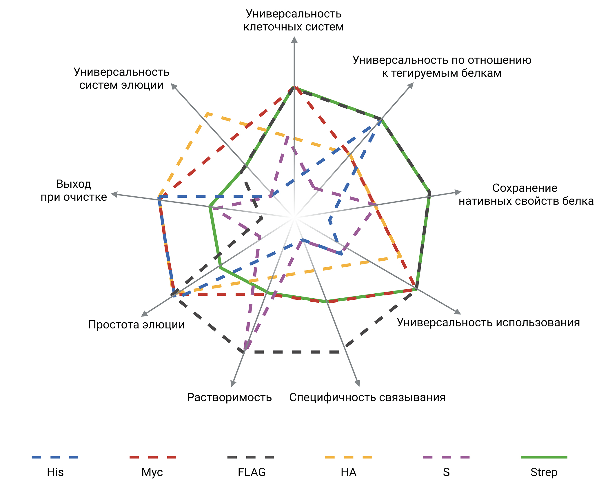 На рис. 2 приведены ключевые суммирующие свойства для наиболее популярных меток: His-, Myc-, FLAG-, HA-, S- и Strep-тегов.