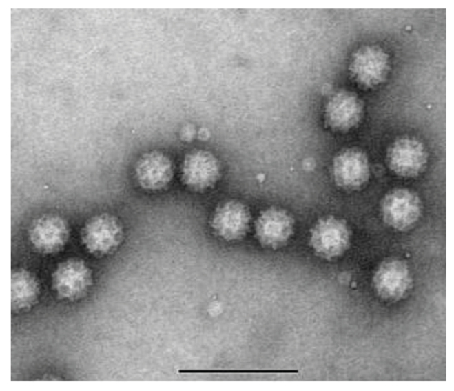 Рис. 1. Трансмиссионная электронная микрофотография частиц саповируса из клинических образцов. Масштабная шкала 100 нм. Источник: https://www.sciencedirect.com/topics/agricultural-and-biological-sciences/sapporo-virus.