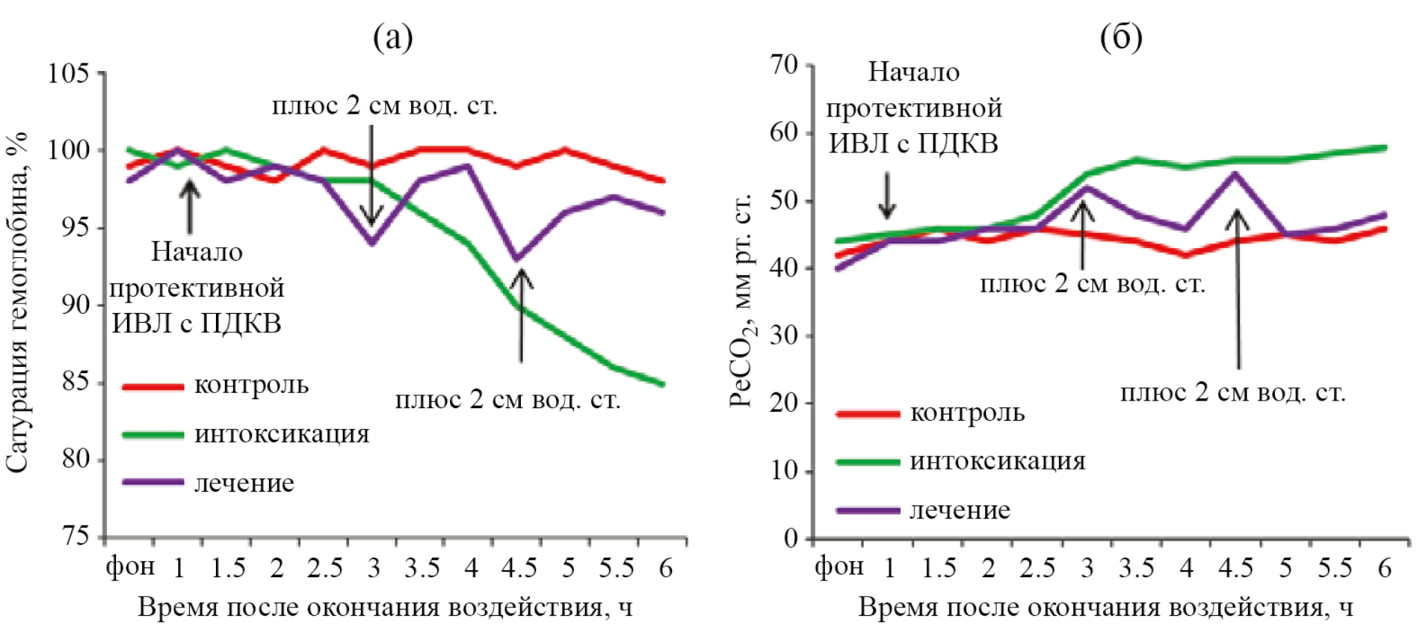 Для индукции анестезии кроликам вводили раствор тилетамина+золазепама (Золетил 100, Virbac, France) 15 мг/кг, внутривенно и пипекурония бромида (Gedeon Richter Ltd., Hungary) 1 мг/особь, внутривенно. После достижения седации и миорелаксации осуществляли интубацию трахеи (трубка № 3,0 с манжетой). Искусственную вентиляцию легких проводили с помощью аппаратов Mindray SynoVent E3 (Mindray, China) и Medtronic Puritan Bennet 840 (Medtronic, USA) в режиме принудительной вентиляции с контролем по давлению. Начало вентиляции осуществляли с параметрами: фракция кислорода во вдыхаемом воздухе (FiO2) — 0.3, положительное давление в конце выдоха (ПДКВ) — 5 см вод.ст., пиковое давление — 13–15 см вод.ст., частота дыхания — 35–40×мин–1, на этом фоне дыхательный объем составил 20–25 мл, а минутный объем дыхания — 0.7–1.0 л/мин. Поддержание анестезии осуществляли путем введения тилетамина+золазепама (5 мг×ч/кг внутривенно с помощью инфузомата) и пипекурония бромида (0.5 мг/особь внутривенно при появлении спонтанного дыхания). Респираторную поддержку животным группы контроль и лечение начинали через 1 ч после воздействия, проводили в течение 5 ч.