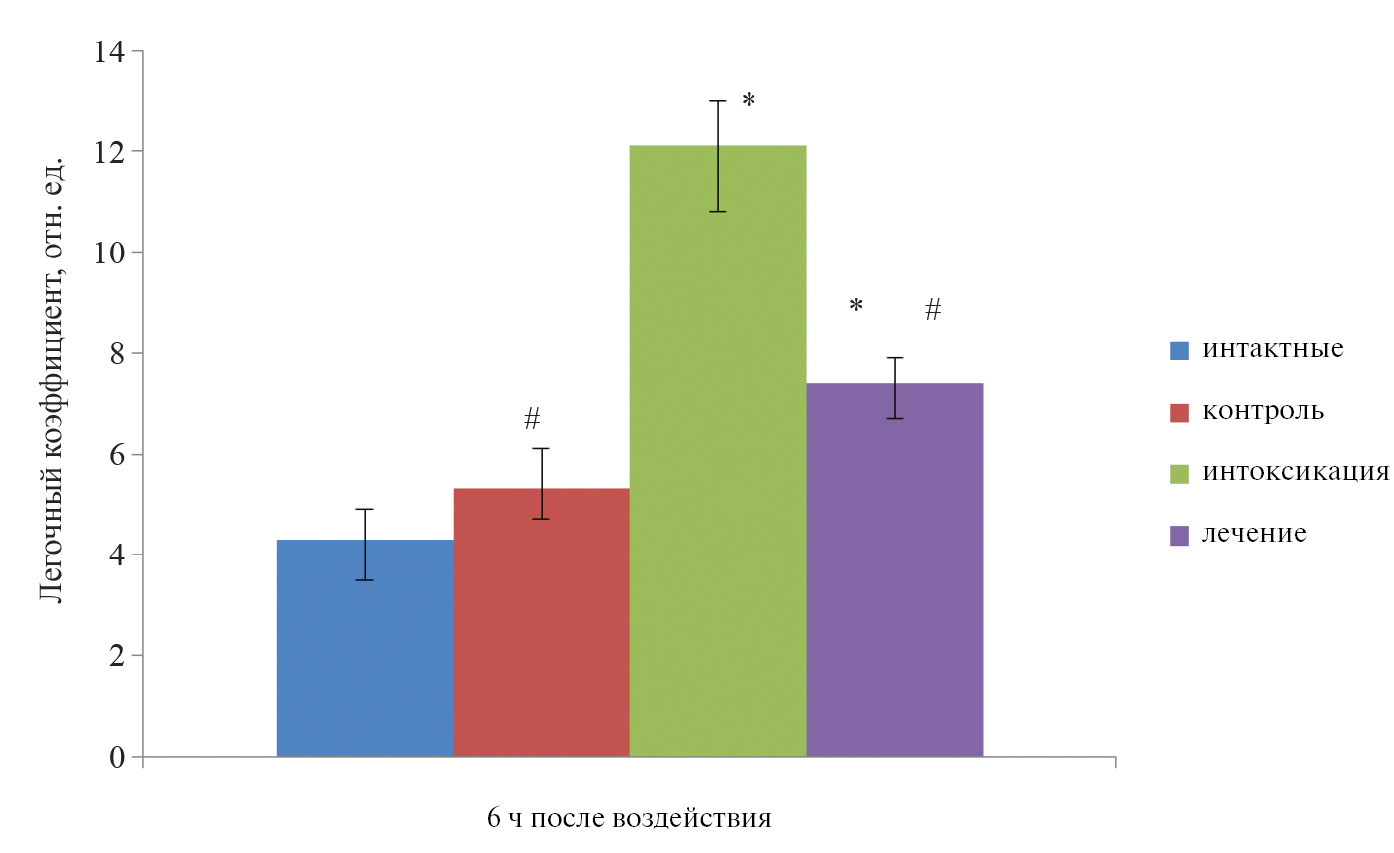 Легочный коэффициент кроликов группы контроль, определенный через 6 ч после воздействия атмосферного воздуха, не значимо отличался от легочного коэффициента интактных животных (рис. 2).