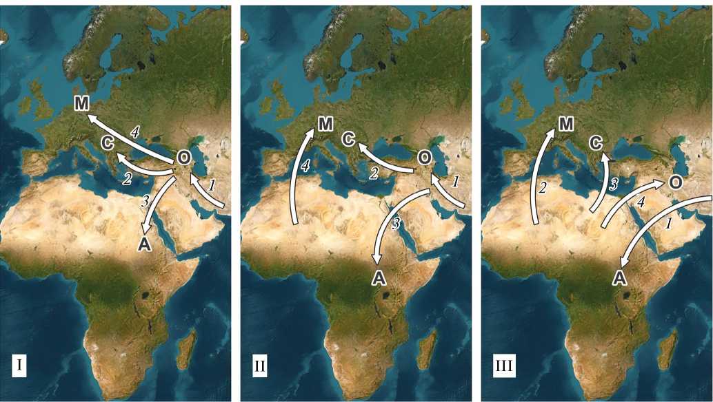 Рис. 1. Три сценария расселения подвидов медоносной пчелы: I — гипотеза (Ruttner, 1988), II — гипотеза (Arias, Sheppard, 1996), III — гипотеза (Whitfield et al., 2006). М, С, А и О — эволюционные ветви; 1–4 — порядок географической миграции пчел.