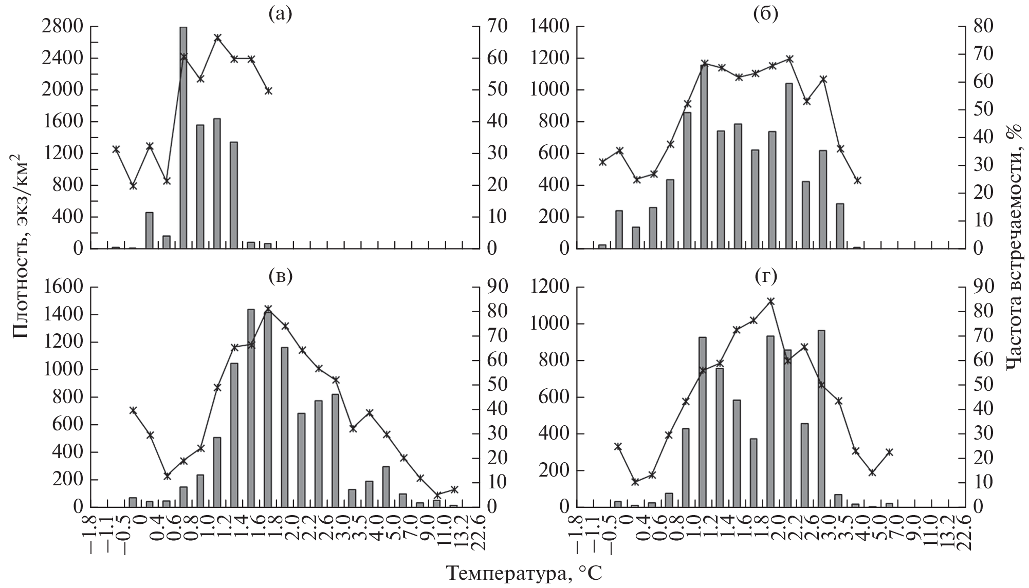 The purplegray sculpin Gymnocanthus detrisus occurs at the depths between of 17 and 595 m at the temperature from –1.1 to+13.2°C off the mainland coast of the Russian waters of the Sea of Japan. In the warm period, the fish are concentrated in the middle and lower parts of the shelf, mainly at a temperature of 1.2–2.0°C, in the cold period, in the lower part of the shelf and the upper part of the continental slope at 0.6–1.4°C. The water area in the north (the waters of the Tatar Strait) is intensively used only in the warm season. The main aggregations are formed in the south (Peter the Great Bay) and in the areas of the central part of the surveyed region. Juveniles are more eurythermal than adult individuals and more adults prefer the shelf zone in all seasons, where the temperature regime is less stable than on the mainland slope.