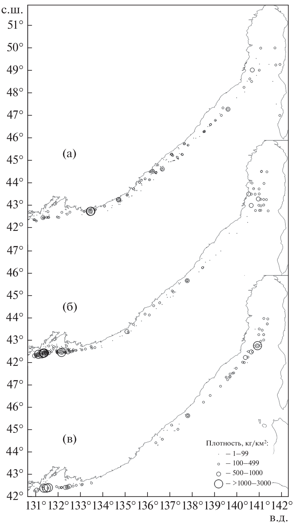 The research outcomes of spatial and bathymetric distribution of dragon poacher Percis japonica are reported based on the bottom trawl surveys carried out in the Russian territorial waters in the Sea of Japan. The species can be found in the waters along the entire coastline. However, its spatial distribution pattern is variable. Thus, its distribution is sparse off the coasts of West Sakhalin, especially off the southern part of the island, while the species tends to congregate in the Peter the Great Bay and the Tatar Strait, where the locations of the species across these water areas remain almost unchanged throughout the year. With respect to the Northern Primorye Coastal Zone, the even distribution is typical for the entire water area, without any high congregation locations. Therefore, the dragon poacher can be found in wide ranges of depths and temperatures. However, its preferable ranges are substantially narrower. The highest values for available biomass resources are typical for the water areas off the Northern Primorye Coastal Zone.