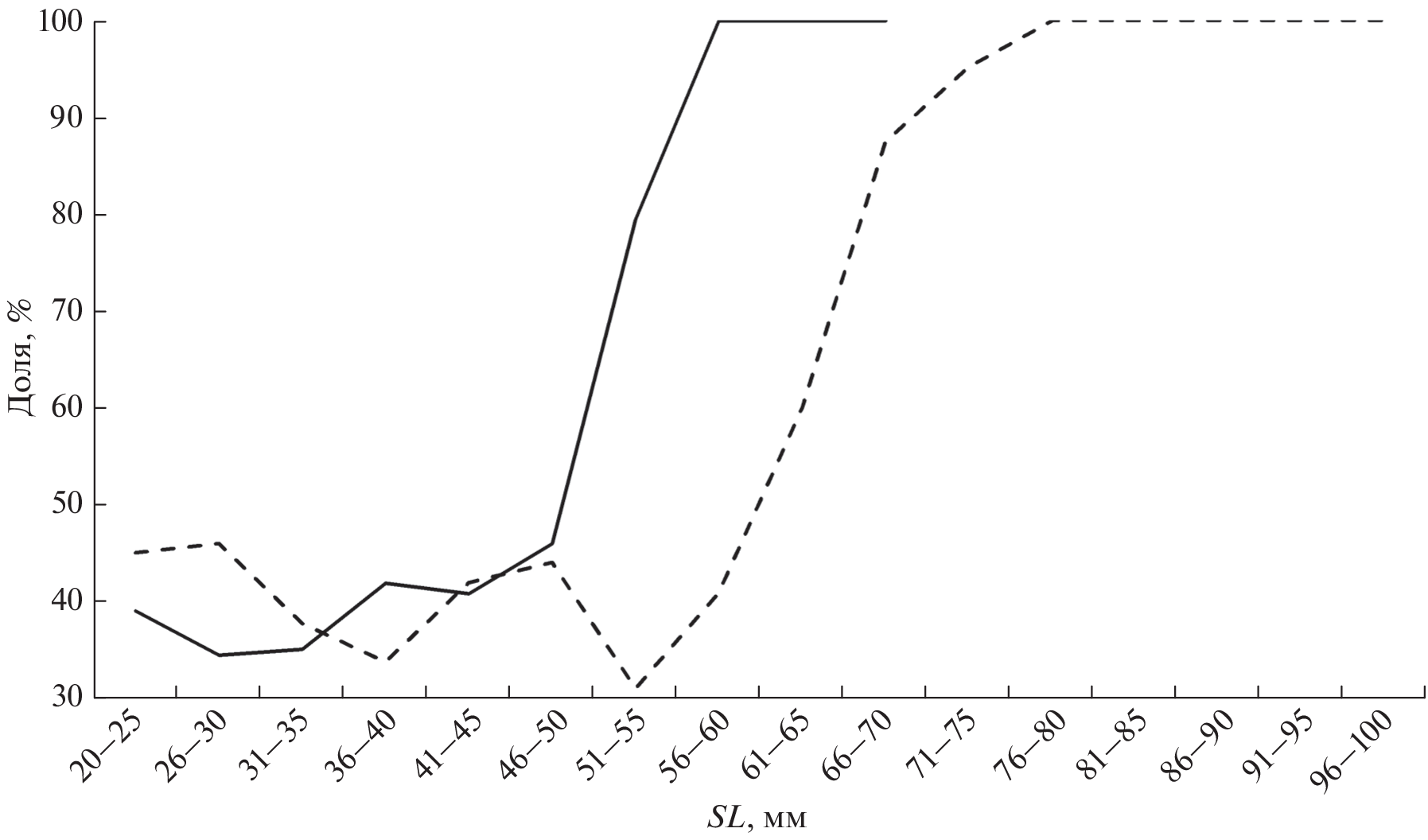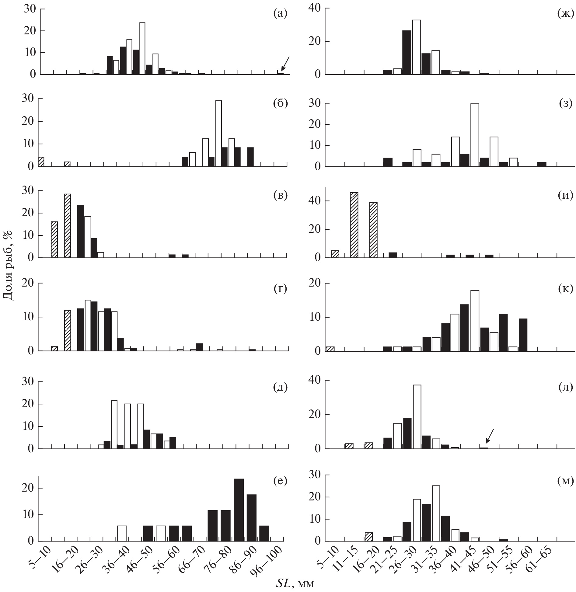 Приведена характеристика размерно-возрастной и половой структур аборигенных в Донском бассейне звёздчатой Benthophilus stellatus и донской B. durrelli пуголовок. Самки донской пуголовки созревают при длине около 35, звёздчатой – 50 мм. Для основной части (~74%) производителей донской пуголовки характерен единовременный нерест, звёздчатая откладывает три порции икры. Продолжительность периода размножения у этих видов составляет около 3.5 и 1.5 мес. соответственно, а индивидуальная абсолютная плодовитость самок – 0.2–0.6 и 1–3 тыс. икринок. Все производители донской пуголовки погибают после нереста на втором году жизни, незначительная часть особей звёздчатой пуголовки доживает до третьего года. Оценены спектры питания, размерная и биотопическая изменчивость, степень пищевого сходства, избирательность кормовых организмов у обоих видов. Для них характерны сходство питания и высокая пищевая пластичность. В Цимлянском водохранилище у пуголовок основными кормовыми объектами являются моллюск Lithoglyphus naticoides и личинки комаров, в нижнем течении р. Дон – различные ракообразные. Обосновывается предположение о том, что в настоящее время в водохранилищах Волжского каскада обитает три вида пуголовок (донская, звёздчатая и Махмудбекова B. mahmudbejovi). Донская пуголовка расселилась и в нижнем течении р. Волга. Её ареал помимо нативного Азовского и новоприобретённого Волжского бассейнов, по-видимому, включает в себя и Черноморский.