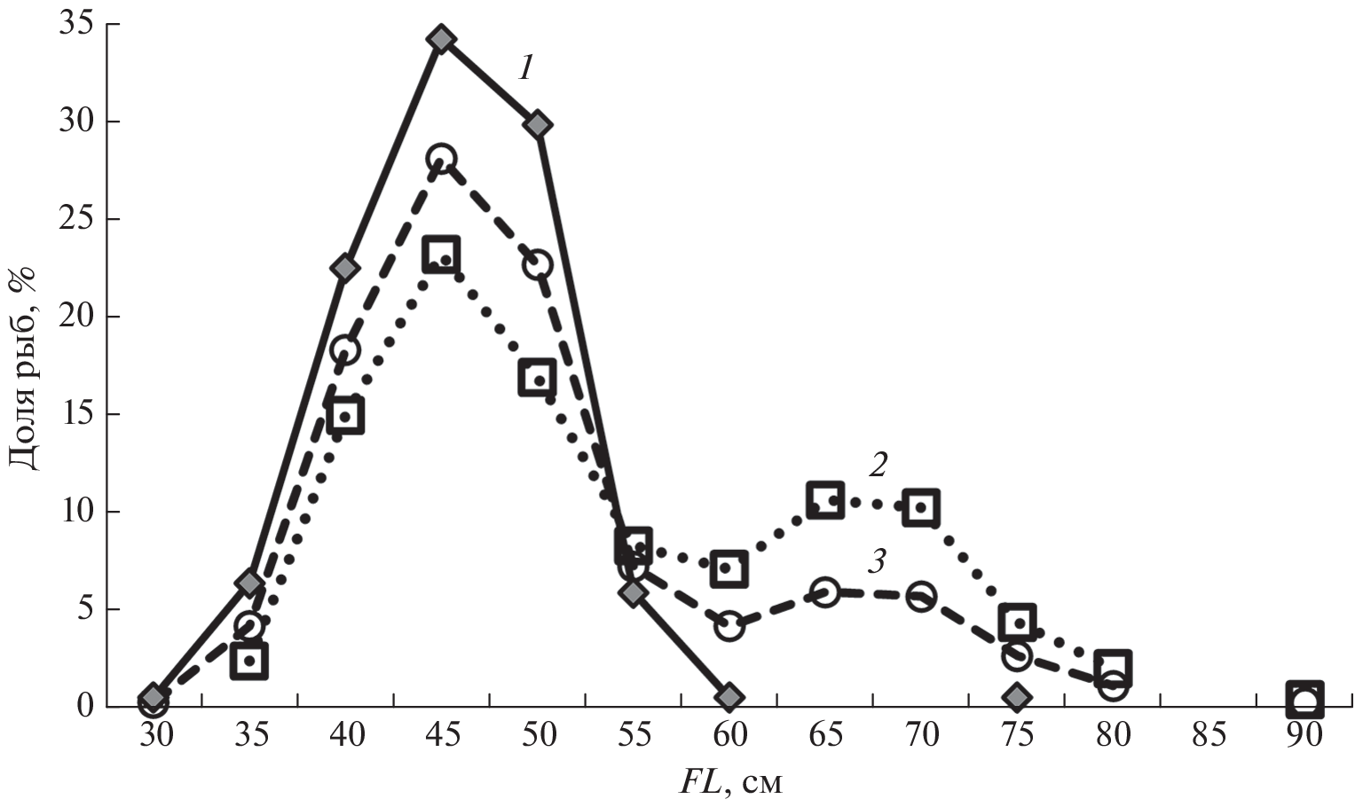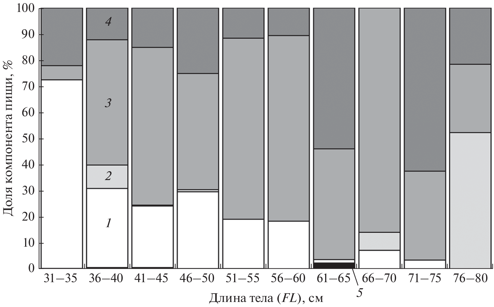 Рассмотрены пространственное распределение, размерно-половой состав, питание многоиглого керчака Myoxocephalus polyacanthocephalus и сопутствующие виды в тихоокеанских водах северных Курильских островов и Юго-Восточной Камчатки в осенний период. В августе–ноябре 1997 г. этот вид в уловах был представлен особями длиной 30–89 (в среднем 47.8 ± 0.5) см и массой тела 300–11 000 (2321 ± 90) г. Самки доминировали над самцами в соотношении 1.2 : 1.0. Зависимость массы тела от длины керчака описывается степенным уравнением: W = 0.0031FL3.446 (R2 = 0.935). Основу питания керчака составили рыбы (56.2% массы пищи), преимущественно минтай Gadus chalcogrammus и северный однопёрый терпуг Pleurogrammus monopterygius (соответственно 19.9 и 11.9%); отходы рыбопереработки (19.6%), главным образом головы северного однопёрого терпуга (12.2%); а также десятиногие ракообразные (Decapoda) (18.6%), в основном краб-стригун Chionoecetes opilio (14.1%). С ростом в питании керчака десятиногие ракообразные замещаются рыбами, а минтай вытесняется северным однопёрым терпугом и Liparidae. Отдельные участки исследованного района различались как размерно-половым составом и составом пищи керчака, так и видовым составом сопутствующих ему видов. Совместная встречаемость керчака с минтаем и северной двухлинейной камбалой Lepidopsetta polyxystra составила 100%.
