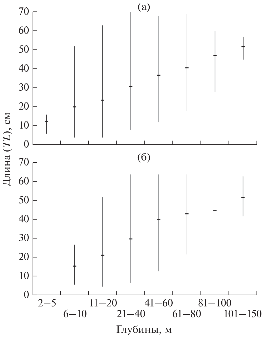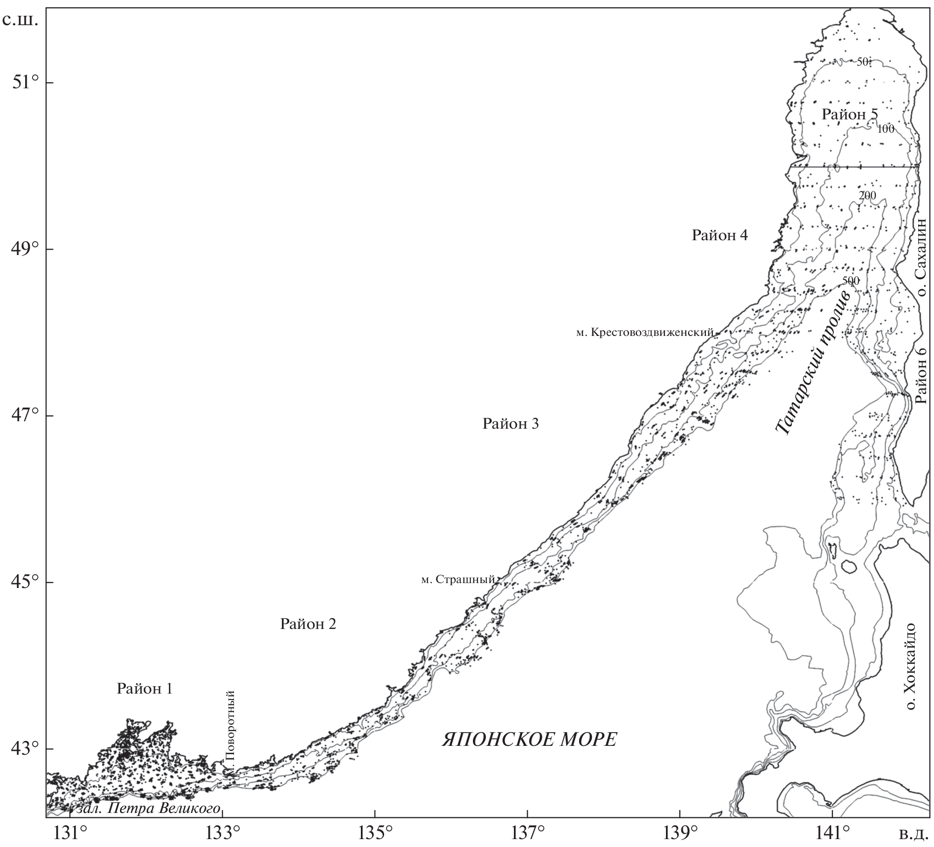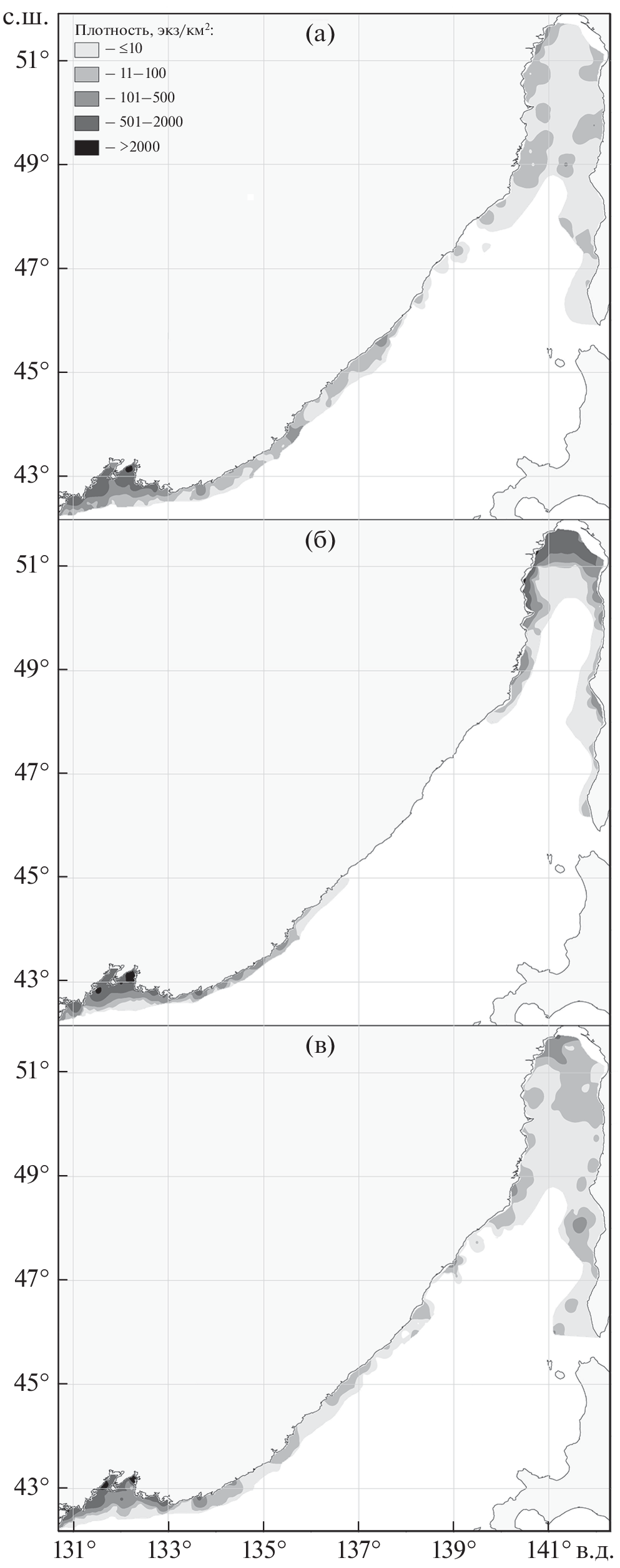 Two intraspecific groups of the plain sculpin Myoxocephalus jaok inhabiting the Russian territoral waters in the Sea of Japan, representing the northern and southern species groups, have been revealed. In a summer season, the species groups are separated from each other by a wide water area extending from 45° to 48° N. The northern species-group nucleus in this period is located in the Tatar Strait inlet, while the southern species group inhabits the Peter the Great Bay. In the summertime, the plain sculpin prefers the upper slope shelf area with water column depths ranged from 80 m (for the southern species group) to 60 m (for the northern species group). The juvenile fish tend to be found in shallower waters as opposed to the mature fish. In a cold season, the majority of fish stocks of the southern species group is still congregating in the Peter the Great Bay, shifting to the shelf edge and the continental slope. Some porton of male fish remains at spawning grounds in the coastal zone to the springtime to guard egg clutches. The specimens of the nothern group leave the shallow-water Tatar Bay inlet at massive level to congregate over the winter in the locations of a deep-water area off the mid-coastal zone of the Sakhalin Island. The specimens of the northern group reach the body length of 67 cm, while the sizes in the southern fish group are larger, reaching 75 cm in length.