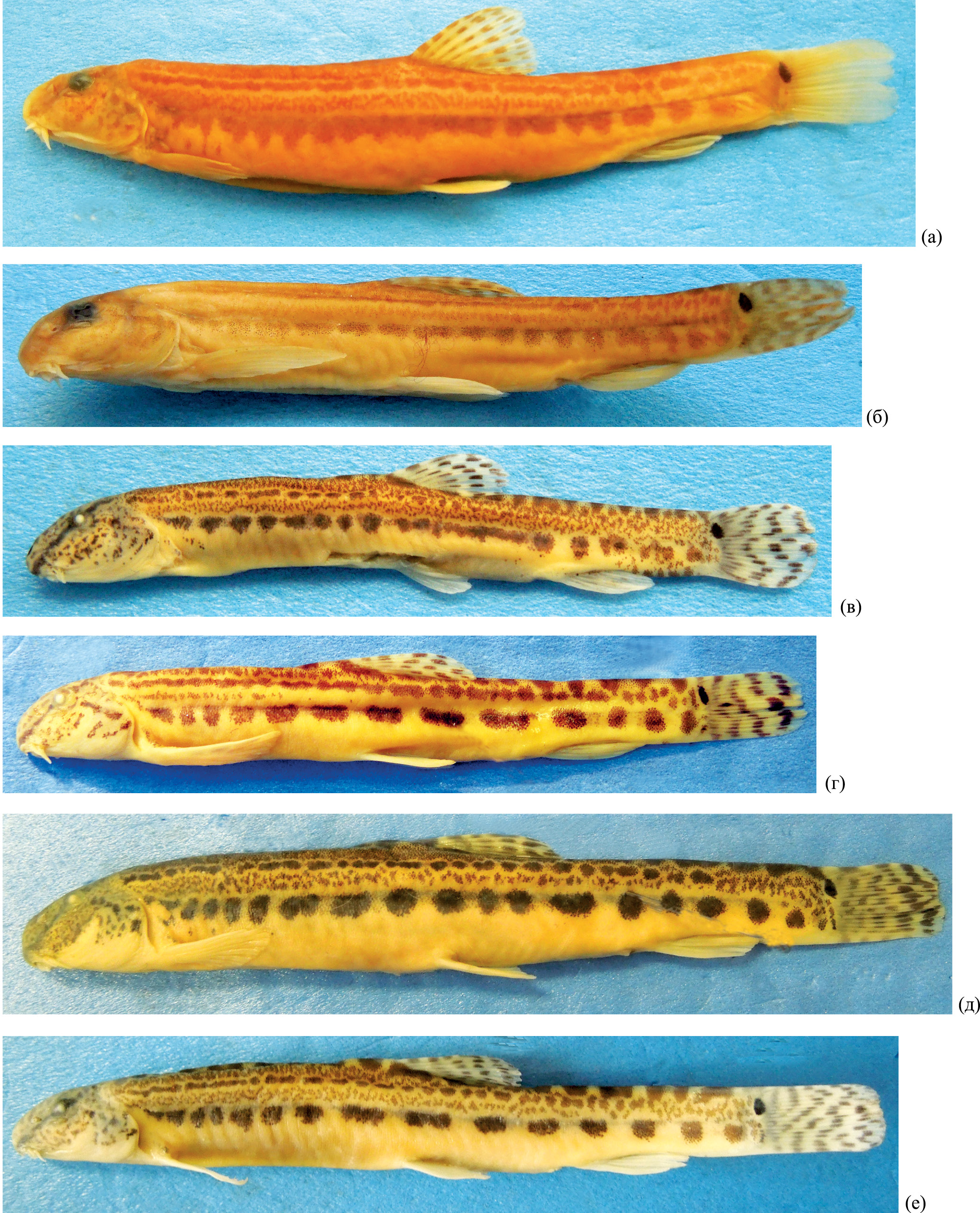 Рис. 1. Щиповки рода Cobitis из водоёмов Колхидской низменности, внешний вид сбоку: а – самка SL 72.0 мм ЗММУ Р-24570, р. Ногела; б – самец SL 56.5 мм ЗММУ Р-24570, р. Ногела; в – самка SL 44.0 мм ЗММУ Р-24569, р. Охаркали; г – самец SL 44.0 мм ЗММУ Р-24566, р. Сепа; д – самка SL 82.5 мм ЗММУ Р-24566, р. Сепа; е – самка SL 69.0 мм ЗММУ Р-24570, неотип Cobitis osurgeticus, р. Натанеби.