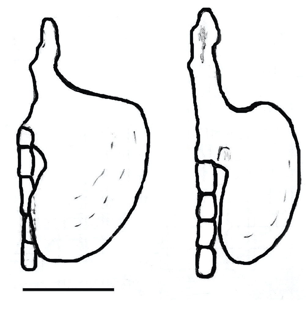 Орган Канестрини у изученных щиповок большой, широкий, топорообразной формы (рис. 4), ширина пластинки составляет около половины её длины (40.7–52.4%). Нижний край пластинки обыкновенно доходит до конца четвёртого членика причленённого к пластинке луча и далее. У мелкого самца SL 44.0 мм из р. Охаркали пластинка заканчивалась на уровне конца второго членика, у одного самца SL 46.5 мм из р. Хоби – на уровне конца третьего членика; среди особей из р. Ногела (изученных на внешнюю морфологию и использованных для краниологического анализа) только у 14.3% самцов пластинка на левом плавнике не достигала конца четвёртого членика, а заходила за половину пятого и далее (до конца восьмого членика) у 52.4%; на правом плавнике пластинка не достигала конца четвёртого членика у 9.4% самцов, а заходила за половину пятого и далее у 59.4%. Морфометрические признаки изученных особей представлены в табл. 2, 3.