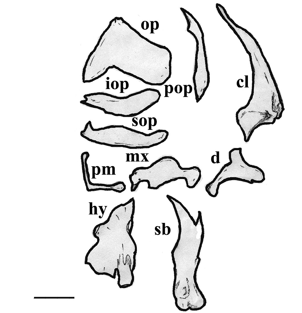 Рис. 7. Кости черепа щиповки рода Cobitis из р. Ногела: op – operculum, pop – praeoperculum, iop – interoperculum, sop – suboperculum, cl – cleithrum, pm – praemaxillare, mx – maxillare, d – dentale, hy – hyomandibulare, sb – суборбитальный шип. Масштаб: 1 мм.
