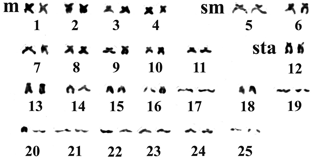 Кариологические исследования выполнены по 22 экз. (21 самец, 1 самка) из р. Ногела. Всем особям прижизненно вводили ~0.05 мл раствора колхицина (0.3–0.4%), и через 4 ч клетки переднего отдела почки использовали для хромосомных препаратов, приготовленных по ранее опубликованному методу (Васильев, 1978). Метафазные хромосомы окрашивали в 4%-ном растворе Гимзы в фосфатном буфере (рН 6.8). От каждой изученной рыбы анализировали от трёх до пяти метафазных пластинок. Хромосомы классифицировали в соответствии с системой, предложенной Леваном с соавт. (Levan et al., 1964). Фотографии митотических хромосом (в метафазе) сделаны цифровой камерой Leica DFC295 (Leica Microsystems, Германия).