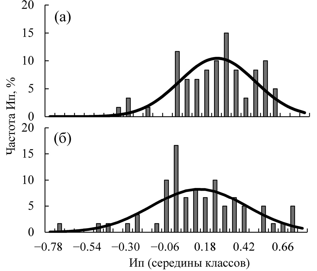 Рис. 2. Частотное распределение индивидуальных значений индекса перемещения (Ип) в 1-й фазе ответа рыб на голодание (5 сут): а – карась Carassius gibelio, б – данио Danio rerio; (¾) – фактические частоты, (―) – плотность нормального распределения. У карася и данио на 5-е сут голодания распределение Ип не отличается от нормального по критерию Лиллиефорса.