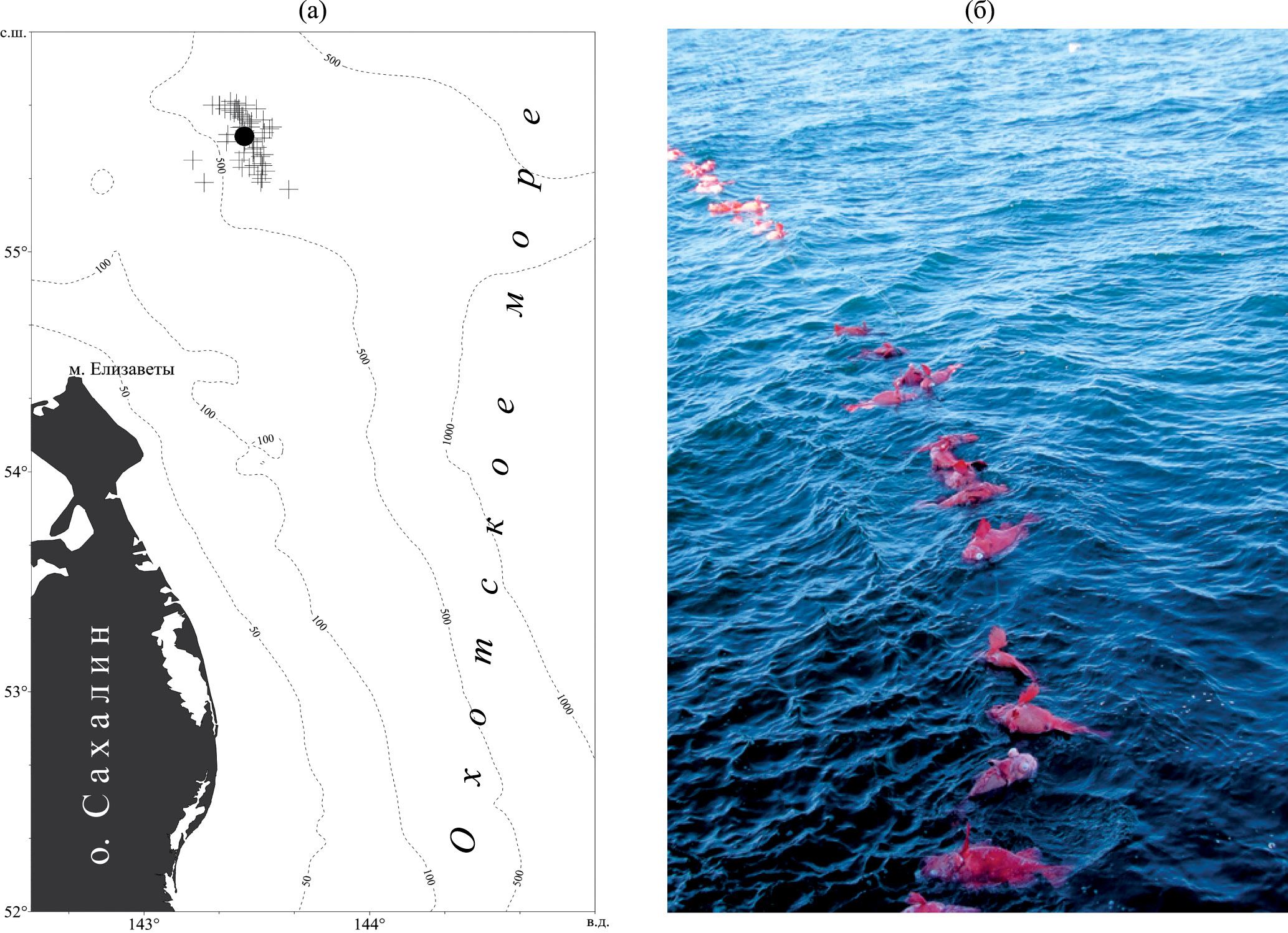 Рис. 1. Участок массовой поимки северного морского окуня Sebastes borealis (а) и часть сети с уловом (б): (+) – порядки донных сетей, (●) – место поимки, (– – -) – изобаты.
