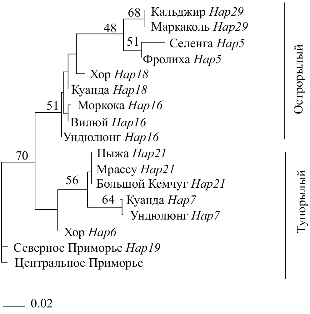 Из 30 аллозимных локусов 18 мономорфны во всех популяциях тупорылого и острорылого ленков: sAAT-1*, ADH*, CK-A1*, CK-A2*, G3PDH-3*, GPI-B*, LDH-A2*, LDH-B1, 2*, LDH-C*, sMDH-A1, 2*, sMDH-B2*, ODH*, PGDH*, PGM-1*, mSOD-1*, sSOD-2*. В этих локусах фиксированы общие для обеих форм ленков аллели. В локусе PGM-2* в выборке из популяции острорылого ленка р. Селенга выявлен с низкой частотой аллель PGM-2*120. В выборке из р. Таёжная у всех шести особей зафиксирован аллель PGM-2*130 (не исключено, что это может быть аллель *120). Однако нельзя исключить и то, что появление этого аллеля является артефактом, связанным с ненадлежащими условиями хранения материала при его доставке в лабораторию. В связи с этим, как и ранее (Осинов, 1993), было принято допущение, что во всех популяциях ленка присутствует основной аллель PGM-2*100. В 12 локусах (sAAT-2*, G3PDH-2*, GPI-A1*, GPI-A2*, IDDH-1*, IDDH-2*, LDH-A1*, sMDH-B1*, MDH-X*, sMEP-3*, sSOD-3*, PGM-2*) выявлен полиморфизм. Частоты аллелей полиморфных локусов приведены в Приложении 4. На NJ-дереве (рис. 2) все популяции острорылого ленка объединяются в одну кладу (бутстреп-поддержка 51%). Часть популяций тупорылого ленка образуют кладу, которая объединяется с кладой острорылого ленка (70%). Популяции тупорылого ленка из Приморья занимают обособленное положение. Если принять, что в популяции ленка из р. Таёжная фиксирован аллель PGM-2*130, то это влияет на длины некоторых ветвей и значения бутстрепов, но не меняет общую топологию дерева (данные не представлены).