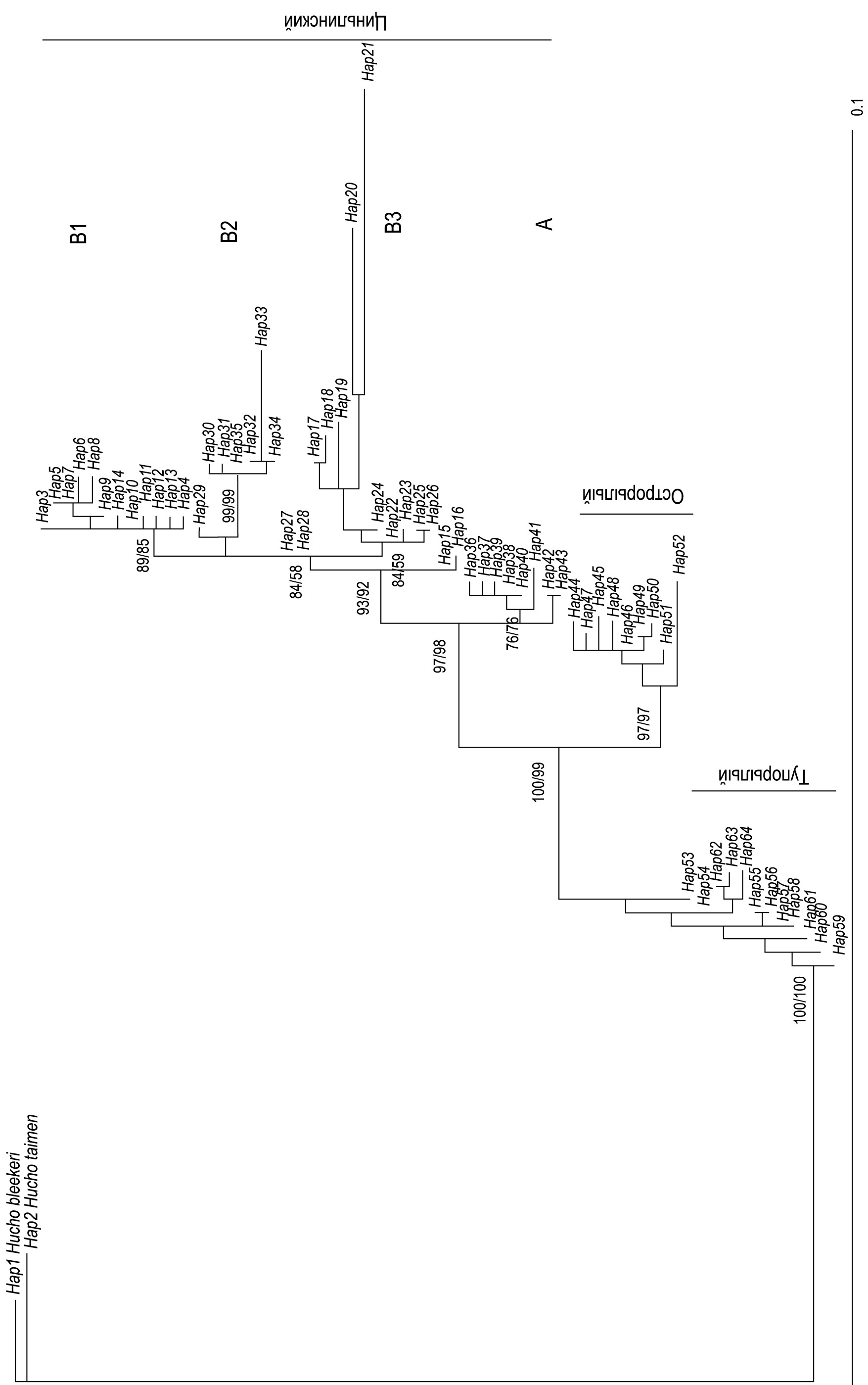 Рис. 4. Дерево гаплотипов (для 987 пар нуклеотидов фрагмента контрольного района митохондриальной ДНК), построенное методом максимального правдоподобия (ML) с использованием оптимальной модели замен (HKY + F + G4). Использованы данные по популяциям циньлинского, острорылого и тупорылого (две последние формы из притоков Амура) ленков рода Brachymystax с территории Китая и Южной Кореи. Две (A, B2) из четырёх (A, B1–B3) субклад циньлинского ленка объединяют гаплотипы из популяций Южной Кореи (пояснения см. в тексте). Значения индексов поддержки (UFBoot/SH–aLRT) приведены на ветвях (UFBoot – ультрабыстрые бутстрепы, SH–aLRT – Шимодаиры–Хасегавы-подобный тест приблизительного правдоподобия). Номера последовательностей GenBank (www.ncbi.nlm.nih.gov/GenBank) и соответствующие им гаплотипы приведены в Приложении 3. Шкала: число замен на сайт.