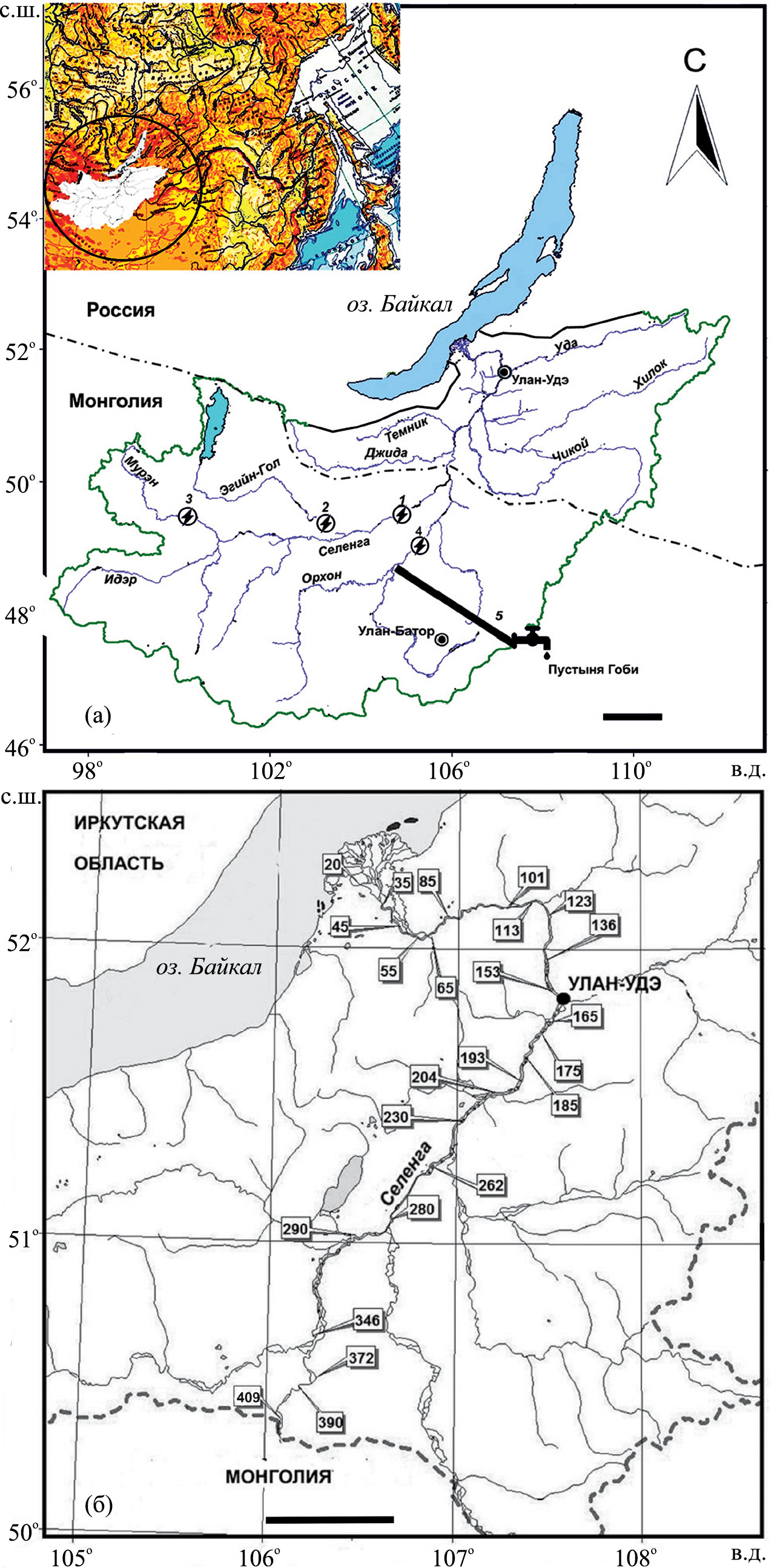 Рис. 1. Озеро Байкал и бассейн р. Селенга: a – гидротехнические сооружения, планируемые в бассейне реки на территории Монголии: 1 – ШурэнГЭС; 2 – ЭгийнГЭС; 3 – ЧаргайтГЭС; 4 – ОрхонГЭС; 5 – водоотвод Орхон–Гоби; б – участки сбора проб (ихтиологические разрезы) икры байкальского омуля Coregonus migratorius, числами указаны расстояния участков от устья р. Селенга. Масштаб, км: а – 100, б – 50.
