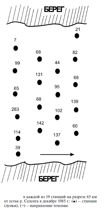 С 1984 г. при изучении нерестилищ омуля в р. Селенга контрольные площадки были заменены профильными разрезами, по 10 проб на каждом (ФМ БайкалНИРО1; Воронов, 1993). В декабре 1985 г. в районе 65 км от устья через всё русло Селенги было отобрано 19 проб грунта с икрой. Станции разместили в шахматном порядке по четырём линиям на расстоянии 30 м друг от друга, расстояние между линиями было тем же (рис. 2), результаты взятия проб икры представлены ранее (Воронов, 1993; Базов, Базова, 2016). Сравнение с применением U-критерия Манна–Уитни показало отсутствие различий между средними значениями плотности икры, полученными при взятии 19 проб, и любой выборки из 10 станций при шахматном размещении их на разрезе (табл. 2).