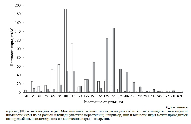 Поскольку распределение икры омуля в р. Селенга с удалением от оз. Байкал приближено к нормальному, место пика распределения икры рассчитывали как средние значения дальности нерестового хода стада в маловодные или многоводные годы.