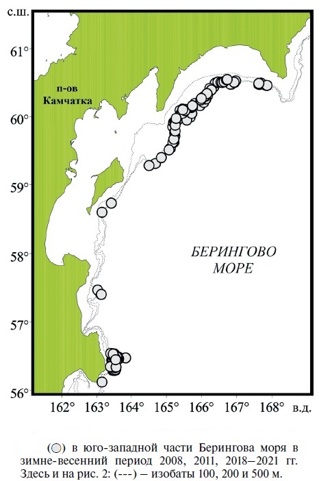 Материал собран авторами в ходе мониторинга донного тралового промысла на судах японской постройки типа “Хокутэн-сэн” в юго-западной части Берингова моря в феврале–мае 2008, 2011 и 2018–2021 гг. Обработаны результаты 208 тралений, выполненных на глубинах 114–600 м (табл. 1, рис. 1). В 2008 и 2011 гг. в качестве орудия лова использовали донный трал ДТ 74/110 (Япония), вертикальное раскрытие которого варьировало в пределах 6–8 м, горизонтальное – 30.9–42.5 м. В 2018–2021 гг. применяли донный трал Selstad 810 msk Streamline (Норвегия) с соответствующими раскрытиями 9–12 и 35.7–45.0 м. Размер ячеи в кутцевой части первого орудия лова составил 60 мм, второго – 110 мм. Скорость судов во время тралений варьировала от 2.6 до 4.1 (в среднем 3.2) узлов.