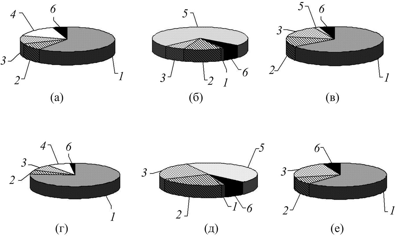 Рис. 4. Спектр питания (%) судака Sander lucioperca, окуня Perca fluviatilis, налима Lota lota и щуки Esox lucius в оз. Сямозеро в 1954–1956 (а, г), 1976–1980 (б, д) и 2015–2020 (в, е) гг.: а–в – объединённые данные по судаку, окуню и налиму; г–е – щука. Кормовые объекты: 1 – ряпушка Coregonus albula, 2 – ёрш Gymnocephalus cernua, 3 – окунь, 4 – плотва Rutilus rutilus, 5 – корюшка Osmerus eperlanus, 6 – прочее. Источники информации: 1960-е гг. – Балагурова, 1963; 1980-е гг. – Попова, 1982; 2015–2020 гг. – наши данные.