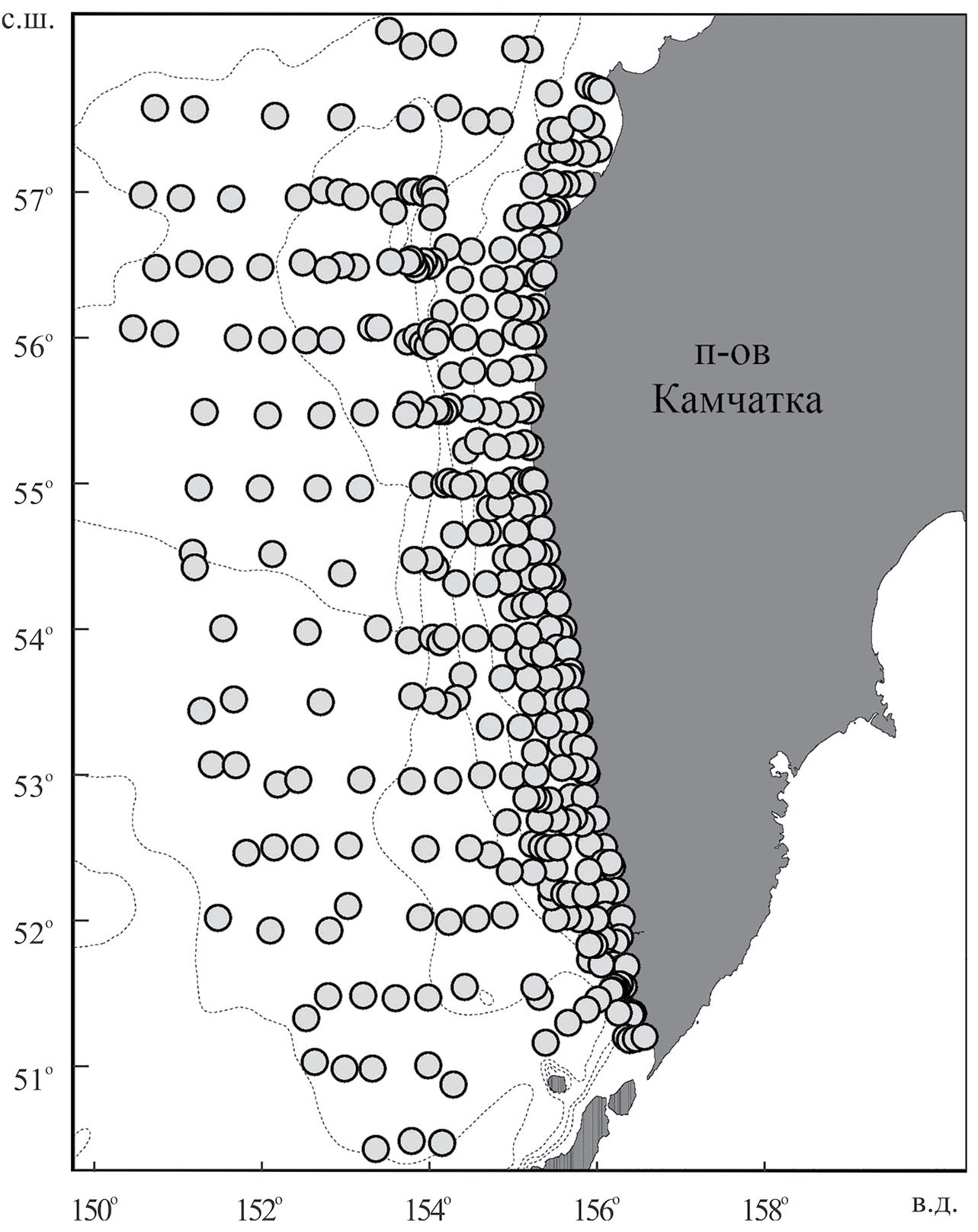 Рис. 1. Схема траловых станций (●), выполненных в северо-восточной части Охотского моря в июле–сентябре 2010 г.