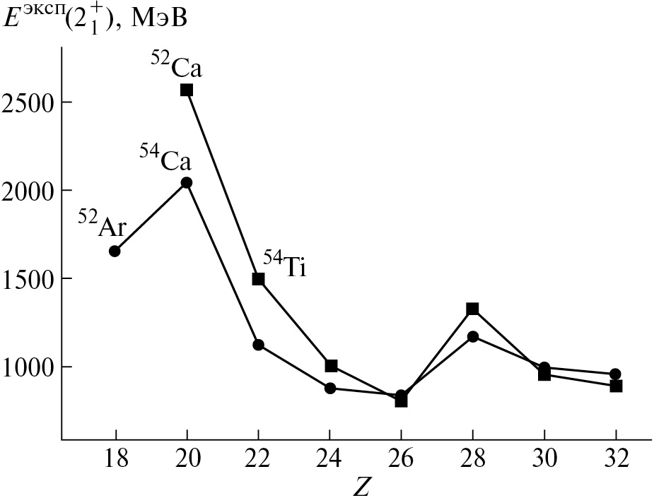 В ДОМ не учитывается вклад тензорного взаимодействия, который важен для количественного объяснения магических свойств 52Ca и 54Ti [4]. За счет тензорных сил протоны заполненной оболочки 1d3/2 в изотопах Са притягивают нейтроны подоболочки 2p3/2 и отталкивают — 2p1/2, расширяя тем самым нейтронную щель N = 32 по сравнению с расчетом по ДОМ. В 54Ti такое действие тензорного взаимодействия ослабевает, так как начинает заполняться протонная оболочка 1f7/2. Несмотря на отсутствие тензорного взаимодействия, ДОМ хорошо описывает динамику необходимого условия для возникновения магического числа N = 32. При увеличении Z среднее между энергиями состояний 2p3/2 и 2p1/2 удаляется от EF (см. рис. 2). При этом минимум разности ∆F достигается для двух ядер: 52Са и 54Ti. Такая картина соответствует исчезновению магических свойств числа N = 32 (рис. 3) с увеличением Z, которое можно проследить по данным о . Высокие значения этой энергии характерны для ядер 52Са и 54Ti. И хотя при переходе от дважды магического ядра 52Са к 54Ti наблюдается существенное уменьшение энергии , ее значение в 54Ti остается выше, чем в изотоне 60Ni с магическим числом Z = 28.