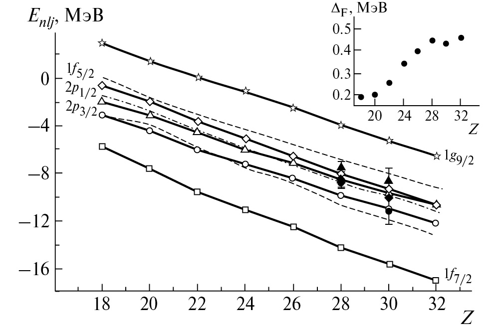 В ядрах с традиционными магическими числами последнее состояние ниже EF с энергией практически полностью заполнено, а первое состояние выше EF с энергией — свободно. Поэтому для таких ядер энергии Sn (с противоположным знаком) отделения нуклона от него и ядра с A + 1 близки соответственно к энергиям и , энергия EF (4) — к их среднему, а основные характеристики ядра хорошо описываются МНЧ. В ядрах 52Са, 54Ti с новым магическим числом N = 32 эмпирические энергии отделения нейтрона –Sn от ядер с (N = 32, Z) и (N = 33, Z) отличаются от расчетных по ДОМ энергий Enlj состояний 2p3/2 и 2p1/2, однако среднее между энергиями Sn близко к среднему между рассчитанными в ДОМ энергиями Enlj. Такое расположение энергии EF характерно и для других ядер с традиционными и новыми магическими числами [14] и может рассматриваться в качестве маркера магичности. Для того чтобы при этом ядро проявляло себя как магическое, необходимо наличие значительной энергетической щели G между и .