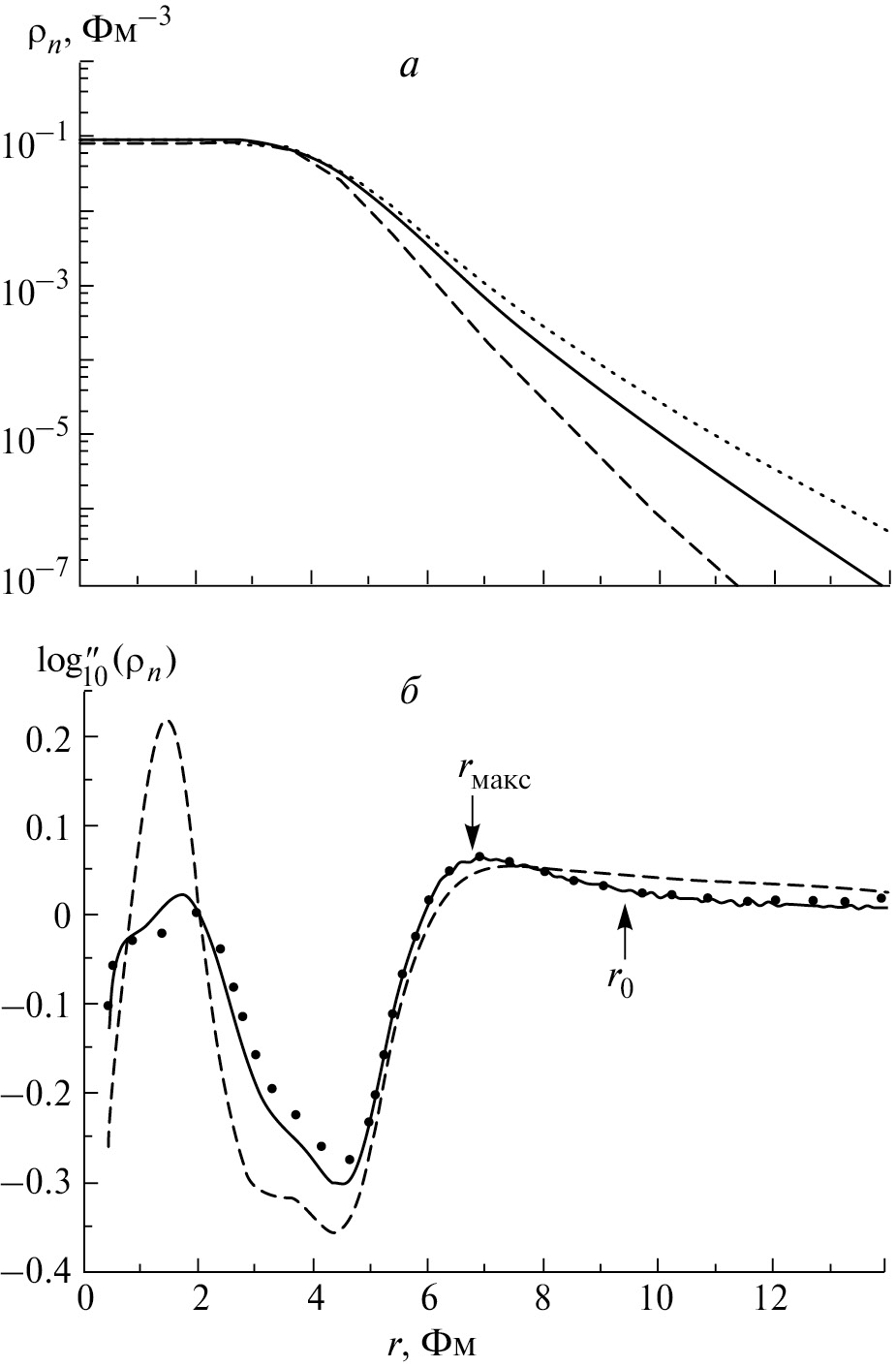 Рис. 5. Нейтронная плотность ρn(r) (а) и вторая производная от ее логарифма (б) для изотопов 48Са (штриховая кривая),52Са (сплошная) и 54Са (точечная).