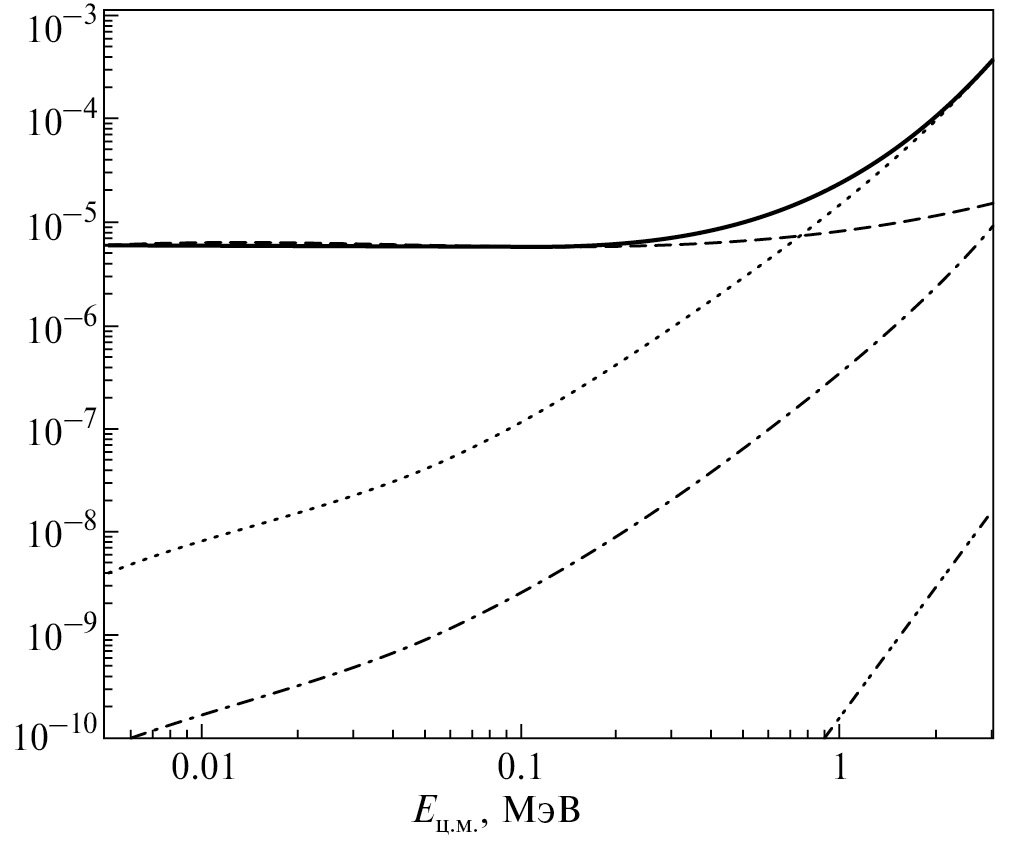 На рис. 2 анализируются вклады различных парциальных E2-захватов в энергетическую зависимость рекомендованного полного астрофизического S-фактора реакции 2H(d, γ)4He. Вклад перехода из канала 5D2 (штрихпунктирная с одной точкой кривая) является малым при рассмотренных энергиях. Переход из канала 5G2 (штрихпунктирная с двумя точками кривая) пренебрежимо мал. Как и следовало ожидать, эти D- и G-волновые переходы в конечное D-волновое состояние подавлены из-за присутствия центробежного барьера во входных каналах и малости D-волновой компоненты полной волновой функции конечного состояния. При относительно низких энергиях поведение полного астрофизического S-фактора определяется переходом из канала 5S2 (штриховая кривая). При более высоких энергиях проявляется переход из канала 1D2 (точечная кривая), чему способствует огромная S-волновая компонента полной волновой функции 4He. При энергиях в окрестности 800 кэВ вклады доминирующих переходов из каналов 5S2 и 1D2 сопоставимы друг с другом.