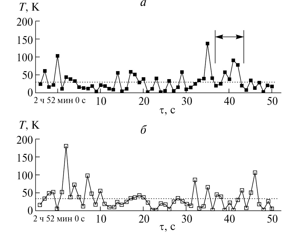 Для улучшения отношения сигнал/шум и повышения достоверности выделяемых событий-кандидатов в эксперименте RGA использовался программный фильтр Винера–Колмогорова, в MGA — аппаратный фильтр Баттерворта (Butterworth’а). Последовательности из 55 событий, полученных на RGA и MGA в диапазоне от 2 ч 51 мин 56 с до 2 ч 52 мин 51 с UT 23.02.1987 показаны на рис. 1 (рисунок соответствует Fig. 2 из [12]). Последовательности характеризуются средней температурой = 29 K для RGA и ≈ 30 K для MGA.