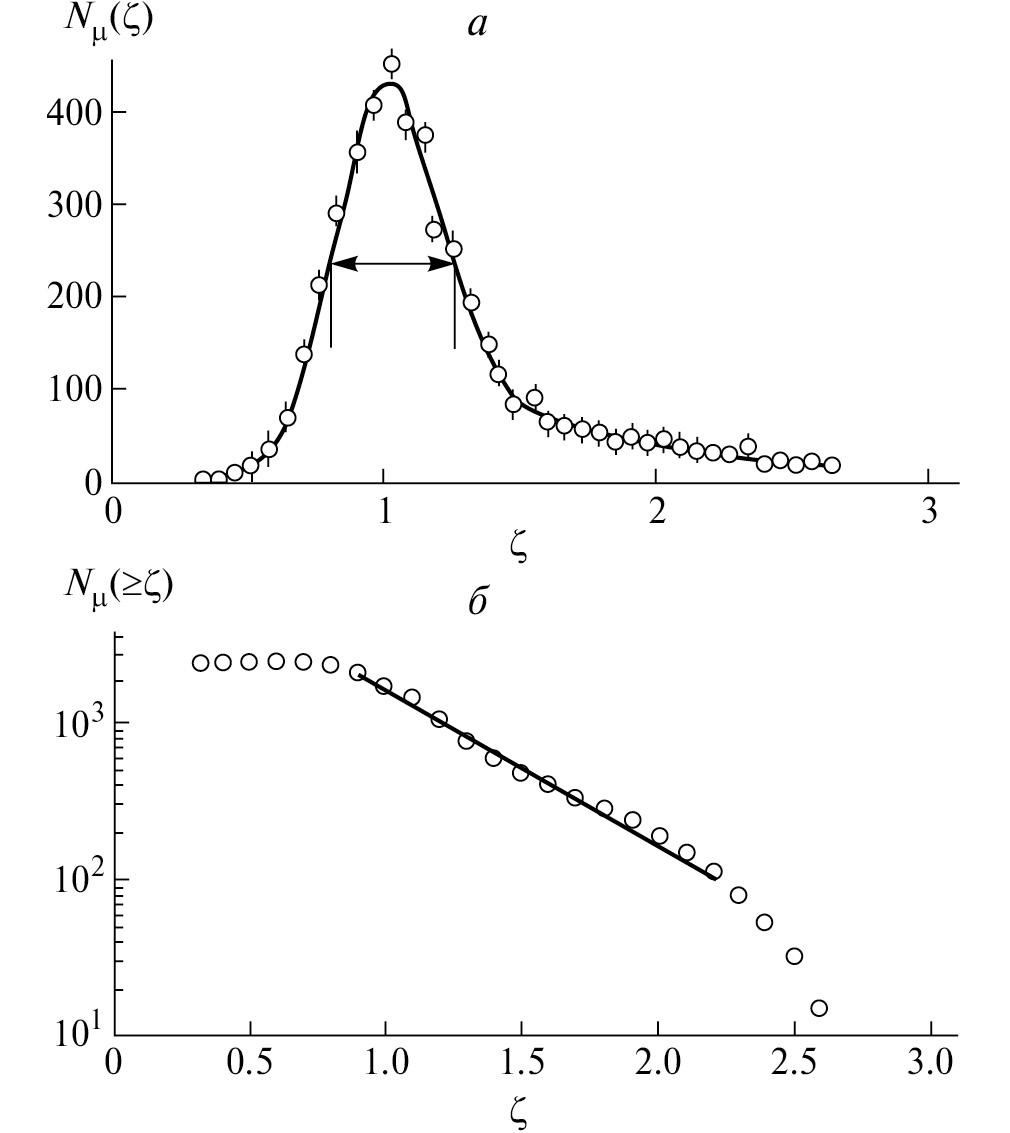 Интегральное распределение Nµ(≥ζ) имеет следующие особенности (см. рис. 3). В диапазоне ∆ζ = 1.35 (0.85–2.2) содержится основная часть (~96%) событий Nµ, при этом зависимость Nµ(≥ζ) от ζ на этом участке носит экспоненциальный характер с показателем = 0.41. Наконец, отношение ∆ζ/ в диапазоне ∆ζ= 1.35 падает в 3.3 раза.
