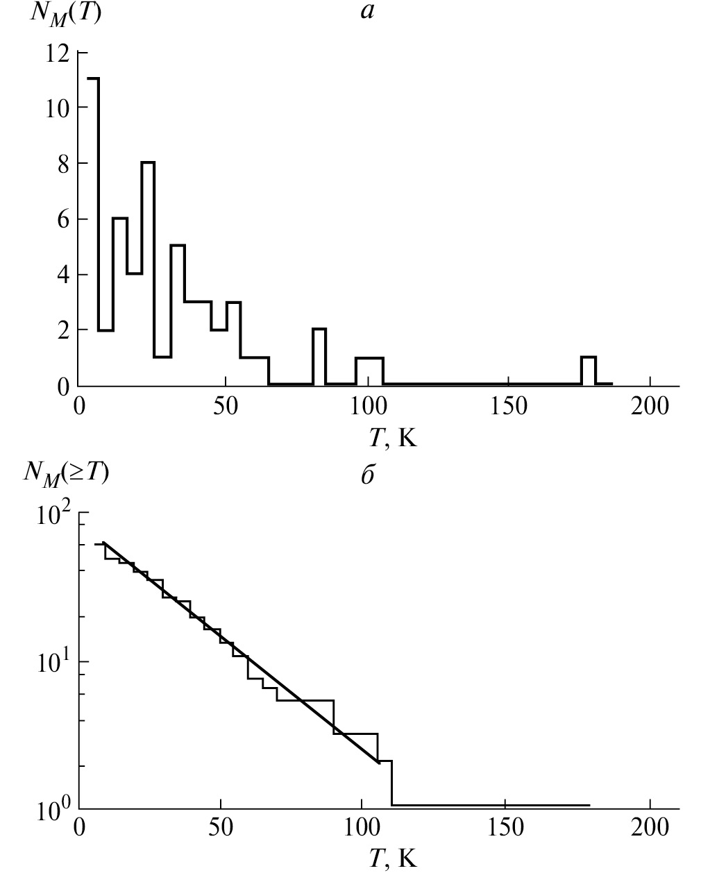Рис. 4. То же, что и на рис. 2, но для 55 событий MGA. На рис. 4, б — exp(–T/) соответствует = 31 K.