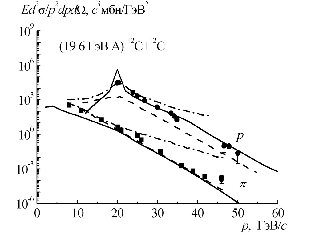 На рис. 1 приведены импульсные спектры протонов и отрицательных пионов, испускаемых в реакции 12С + 12С → p(π) + X под углом 0º при энергии ионов 12С, равной 19.6 ГэВ/нуклон. Экспериментальные данные, полученные в эксперименте на ускорителе У-70 (ИФВЭ) [30], показаны точками. Сплошными кривыми представлены результаты наших расчетов в рамках гидродинамического подхода, при этом параметры расчета — средняя температура hot spot средний химический потенциал средний радиус hot spot — зависят от энергии, штриховые кривые — феноменологическая параметризация А.А. Балдина, штрихпунктирные кривые — результаты расчетов по модели FTFP (фритиоф) [30].