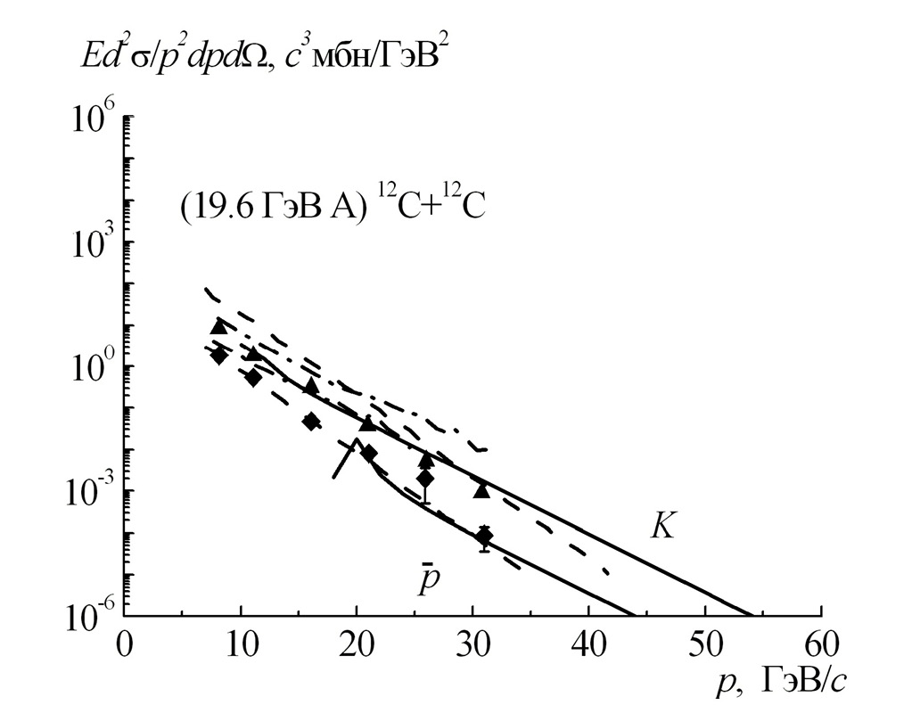 На рис. 2 приведены импульсные спектры каонов и антипротонов, испускаемых в реакции 12С + 12С → K–() + Х под углом 0º при той же энергии ионов 12С 19.6 ГэВ/нуклон. Экспериментальные данные [30] — точки, сплошные кривые — наш расчет, штриховые кривые — феноменологическая параметризация А.А. Балдина, штрихпунктирные кривые — расчеты по модели FTFP [30].
